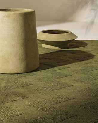 Tetide rugs with zigzag pattern in Moka and Verde Alga colours / Pangea rug with diamond pattern in Rosso Granata colour.