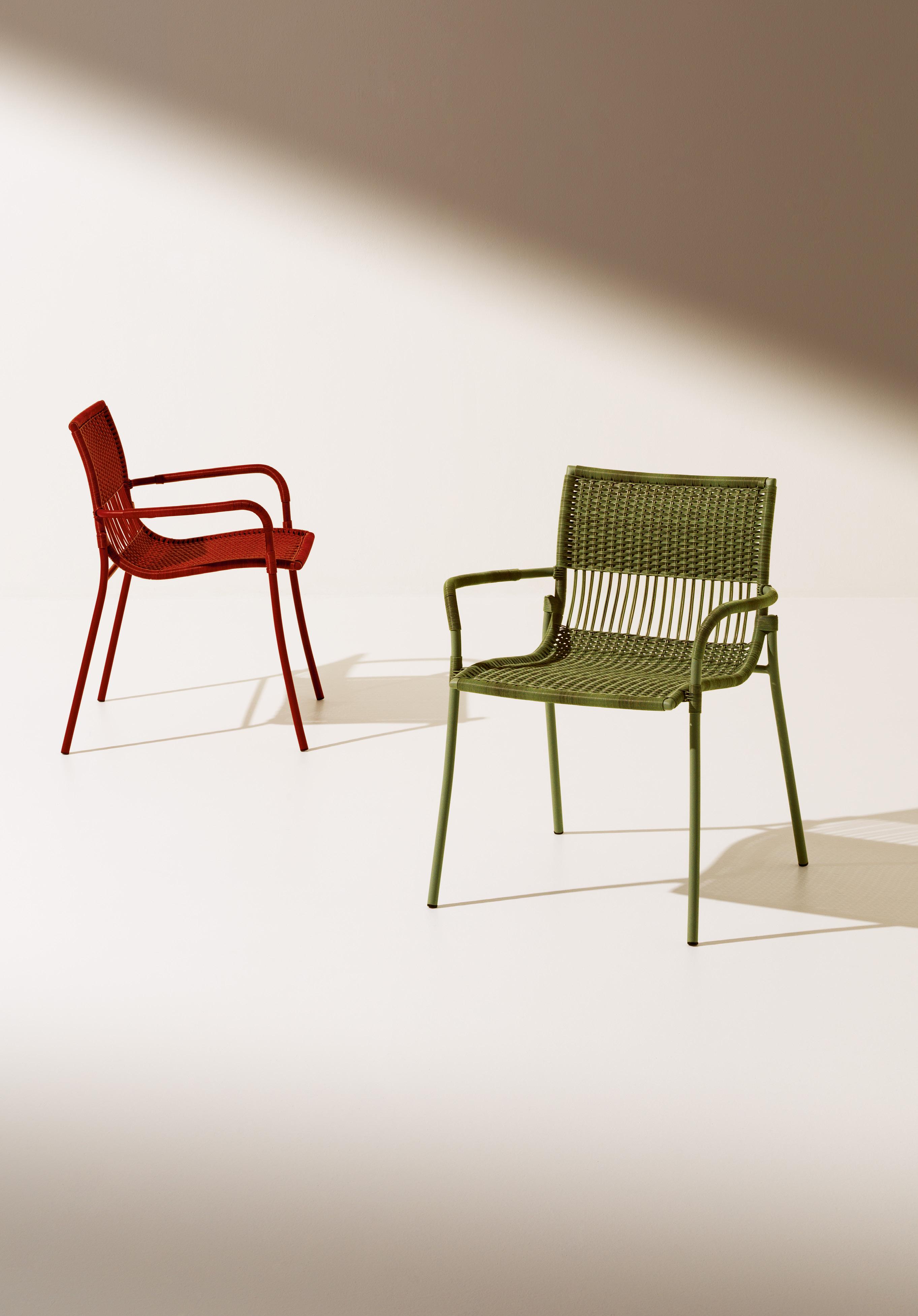 Betsy. Dining armchairs with aluminum frame and woven fiber in Burgundy and Amazonia colors.