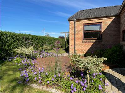 Du kan tro, vi har nydt de ting, vi har fået lavet i haven de seneste par år. Selvom vi langt fra har fået ført hele planen ud i livet, synes vi virkelig vi har fået nogle forskellige rum i haven, som vi ønskede os. Vi nyder at se planterne udvikle sig og høre bierne summe. Her i sommer har vi været særligt begejstrede for vores nye terrasse og alle de skønne blå farver, der har prydet den og stadig gør det her langt henne i efteråret.”