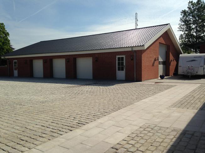 Opgaven lød på design og udformning af belægningsløsninger til ny gårdsplads efter nedrivning af udtjente bygninger og opførsel af ny garage og mur. Stilfuldt og klassisk materialevalg.