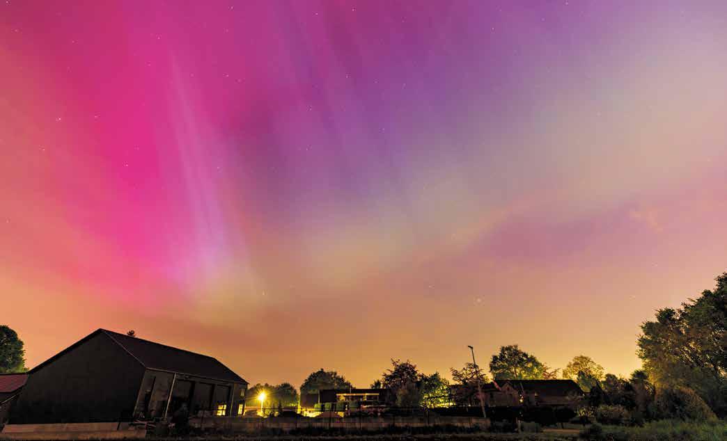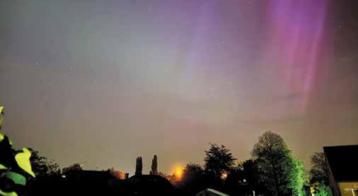 REGIO - Vrijdag 10 mei bevond het Noorderlicht zich boven onze regio. Dat het noorderlicht zo zuidelijk komt, is een erg zeldzaam verschijnsel. Het noorderlicht wordt meestal gezien in de meer noordelijk gelegen delen van Europa. ❱ Foto Mariëlle Govers ❱ Blz 30 Mooi gekleurde lucht