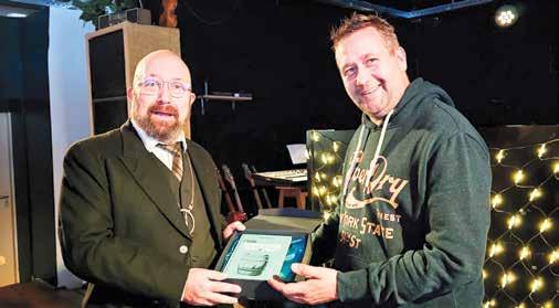 ❱ Op de foto De Börger (Arian Compen) overhandigt het eerste exemplaar aan de voorzitter van Stichting Carnavals Cup.