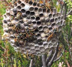 In onze huiselijke omgeving hebben we in de nazomer regelmatig last van wespen die ons lastig vallen als we rustig ons drankje in de tuin nuttigen. Het zijn wespen die afgewerkt zijn. Het wespennest hoeft niet meer uitgebreid te worden en er hoeft geen voedsel verzameld te worden voor larven van nieuwe wespen. Dus gaan ze voor zichzelf op voedsel uit en vinden dat bij ons in de buurt. De nesten van deze wespen kunnen heel groot zijn en te vinden in de grond, in spouwmuren of zolders. In de natuur zijn er ook wespen die een relatief klein nest maken, namelijk de veldwespen. Pakweg voor een honderd nieuwe nakomelingen wordt er een nest gebouwd en dat wordt dan met gekauwde houtvezels vastgemaakt aan een takje. Het bijzondere van deze nesten is dat ze aan de buitenkant helemaal open zijn, je kunt de werksters dan de nodige arbeid zien verrichten om nieuwe nestcellen te maken of larven voedsel te geven. Ook bij deze nesten overwinteren alleen de nieuwe koninginnen die in het voorjaar een nieuw nest beginnen. We onderscheiden de Franse veldwesp en de Bergveldwesp. Beiden zijn door klimaatopwarming ‘onze kant’ opgekomen en regelmatig in onze natuur aan te treffen. De Franse veldwesp heeft meer oranje antennen en vleugels, de Bergveldwesp (zie foto) heeft meer een donker uiterlijk met zwarte antennes.