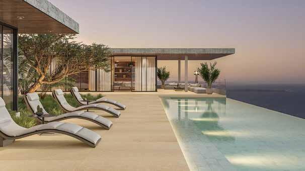 un efecto desbordante, generalmente en el perímetro de la piscina. Además, destaca por ser muy higiénica al arrastrar las impurezas hacia el canal con el flujo del agua. De este modo se mantiene su calidad, reduciendo el uso de productos químicos. Piscina infinity en el proyecto Acantilado con el porcelánico Bottega Topo, de Porcelanosa.