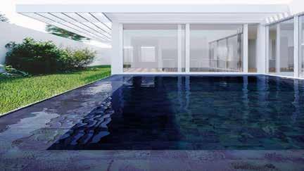 Una tercera posibilidad, más compleja, aunque totalmente personalizada es la siguiente. En primer lugar, cubrir las paredes de la piscina con un mosaico, los bordes con otro modelo y un tercer color para el pavimento conjunto de la terraza. Mosaico Dip Dark con los azulejos para piscina Bali Ubud Matt (ambos de L’ Antic Colonial), y Bottega White, de Porcelanosa.