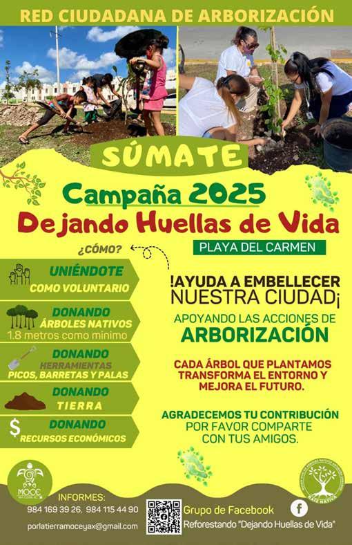 Desde el año 2019, MocE Yax cuxtal A.c. impulsa la campaña comunitaria de arborización “Dejando Huellas de Vida”. Lo que comenzó como una acción local en el Fraccionamiento Villas del Sol ha florecido como un movimiento de amor por la Tierra, extendiéndose a parques, calles, camellones y hasta el Hospital General de Playa del Carmen. Hoy, este esfuerzo colectivo no solo ha sembrado árboles, sino también conciencia, lazos comunitarios y un firme compromiso con el medio ambiente.
