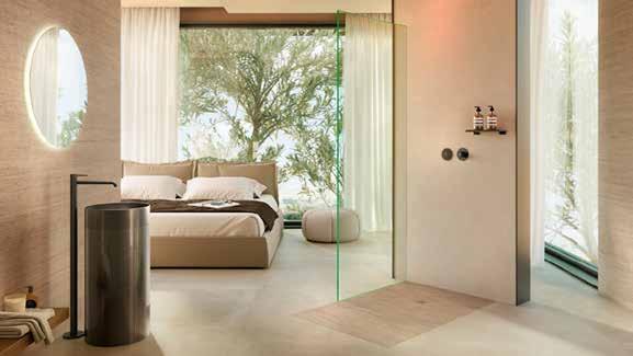 • La iluminación estratégica acentúa la belleza de la piedra travertino o el aspecto del porcelánico imitación mármol travertino de Porcelanosa.