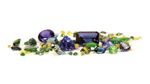Tourmaline, Emerald, Sapphire, Aquamarine, Morganite, Ruby, Tsavorite, Diamonds (not white), Tanzanite, Topaz, Peridot, Variety of Semi-Precious.