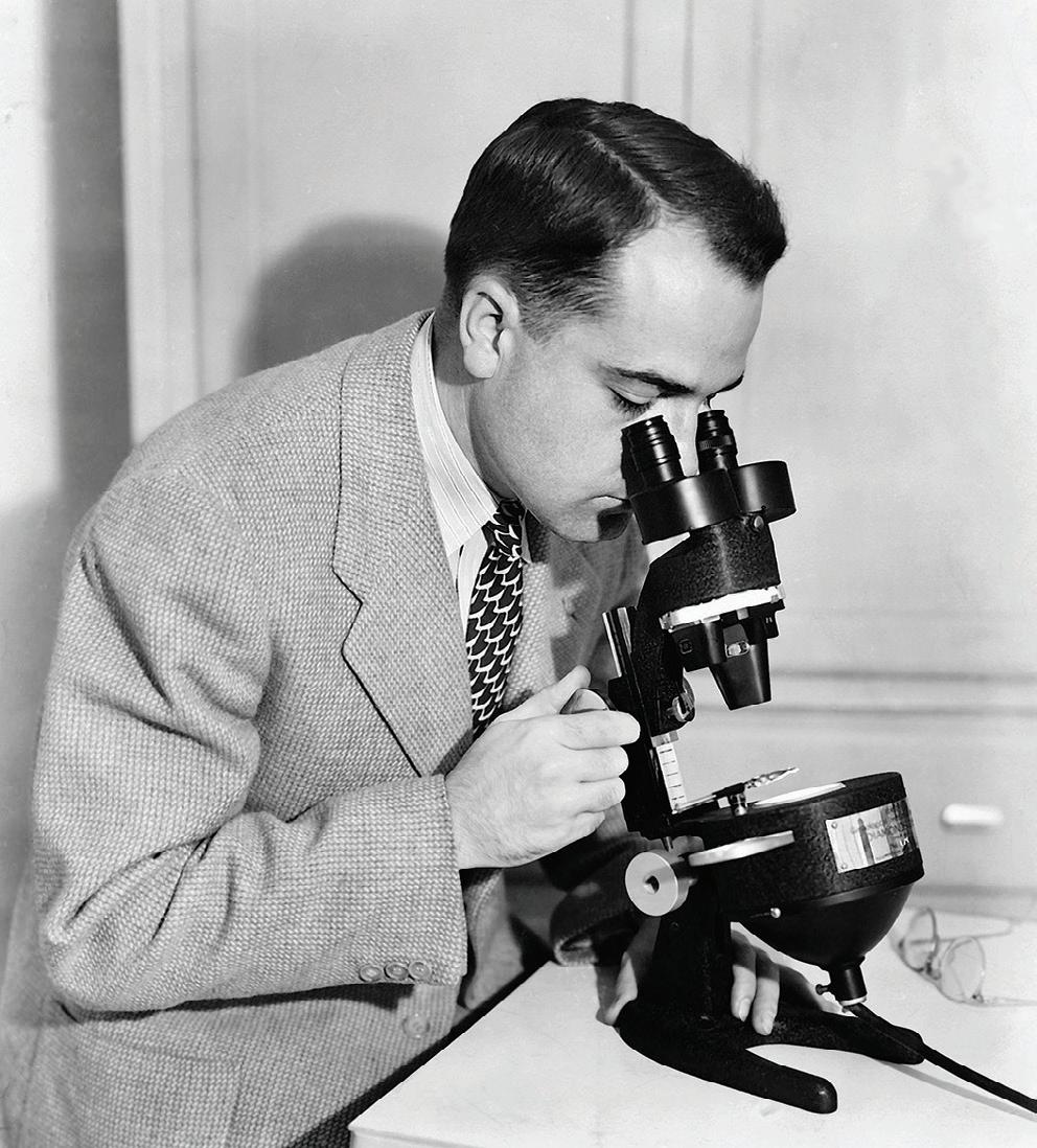 Figure 3. Richard Liddicoat using a stereomicroscope (the GIA Diamondscope) with darkfield illumination. Introduced in 1938, it provided improved viewing of inclusions and clarity features in gemstones.