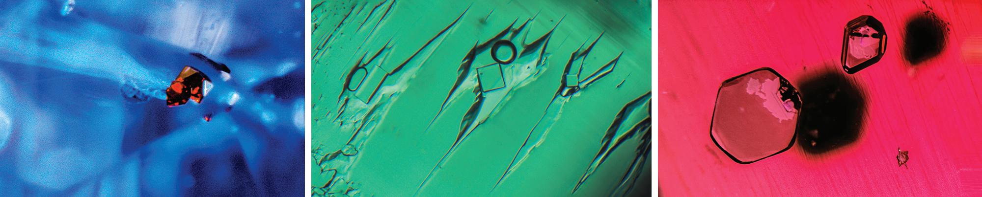 One of the first to describe gemstone inclusions observed with a microscope was the naturalist Isaac Lea, who published sketches of some of these microfeatures (Lea, 1866, 1869, 1876, 1877). The geologist Henry Sorby pioneered the study of rocks and minerals using the microscope and also published works on mineral inclusions in gems (Sorby, 1869; Sorby and Butler, 1869). The diagnostic value of inclusions in gem identification was first elucidated in the 1940s by the legendary gemologist Edward J. Gübelin (1945a,b,c, 1948; see also Kane et al., 2005). These micro-features could provide information on a gem’s identity, quality grade, geologic and geographic origin, method of synthesis, and evidence of treatment. The three volume Photoatlas of Inclusions in Gemstones (Gübelin and Koivula, 1986, 2005, 2008) remains the most significant reference work on mineral and fluid inclusions encountered in the major commercial gemstones. The past several decades have witnessed the introduction of polarizing and color filters, various kinds of illumination (brightfield, darkfield, reflected, diffused, indirect, and fiber-focused), and more recently digital photography and computer processing techniques to enhance photographic images (Koivula, 2003; Renfro, 2015a,b) (figures 4 and 5)