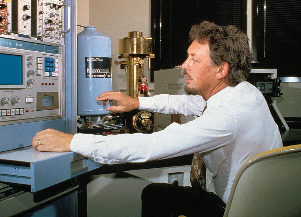 Figure 1. Dr. Vince Manson using GIA’s first scanning electron microscope, acquired in 1976.