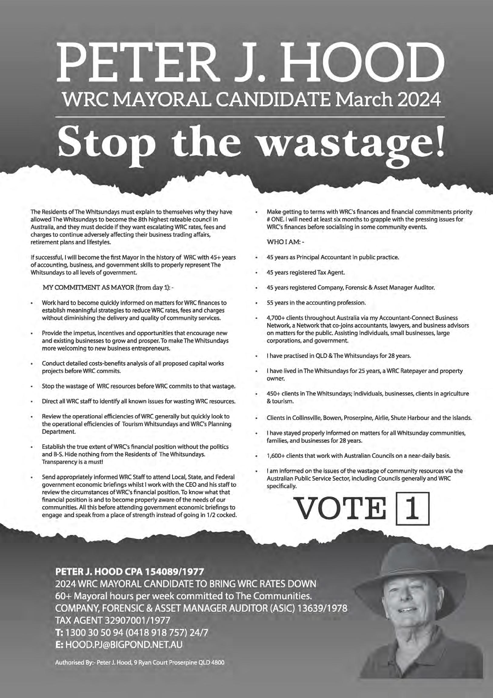 4 Community News Friday March 1st 2024 WHITSUNDAY MAYORAL ELECTION 16 MARCH 2024 How to Vote for Change and Accountability Place a number 1 opposite Richard Evans HOOD RICHARD EVANS BATTY COLLINS 1 Ensure your vote counts and number Richard Evans 1 Authorised by: Richard Evans, 12/12 Eshelby Drive, Cannonvale, 4802 Meet Mayoral Candidate Philip Batty for an informal open mic, no question is off-limits Event YOU’RE INVITED! To an evening of open dialogue and community engagement with Mayoral Candidate Philip Batty at an informal Open Mic Event! 5:30pm Monday 4th March Proserpine Golf Club - Clubhouse 62-104 Anzac Road, Proserpine No question is taboo! This is your chance to ask questions, share your ideas, and get to know Phil Batty’s vision for our region. Whether you’re a long-time resident or new to the area, we hope to see you there! Authorised by Philip Batty 3 Yachtsmans Parade, Cannonvale, 4802 Meet Mayoral Candidate Philip Batty for an informal open mic, no question is off-limits Event. 5:30pm Monday 4th March, Proserpine Golf Club - Clubhouse You're Invited! An evening of open dialogue and community engagement with Mayoral Candidate Philip Batty at an informal Open Mic event! Date: Monday, March 4th, 2025, Time: 5:30 PM 62-104 Anzac Road, Proserpine 4800