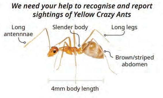Council is urging residents to remain vigilant and report any sightings of unusual-looking ants. Yellow Crazy Ants can be transported through building materials, soil, and potted plants.