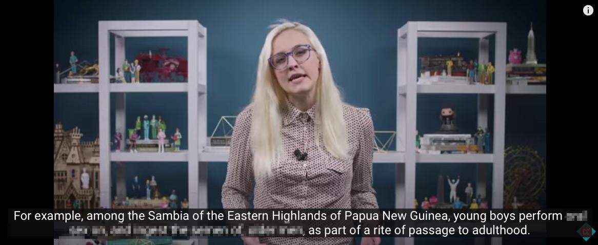 “For example, among the Sambia of the Eastern Highlands of Papua New Guinea young boys perform oral sex on, and ingest the semen of, older men as part of a rite of passage to adulthood.”