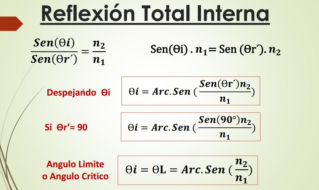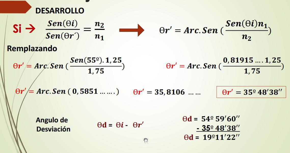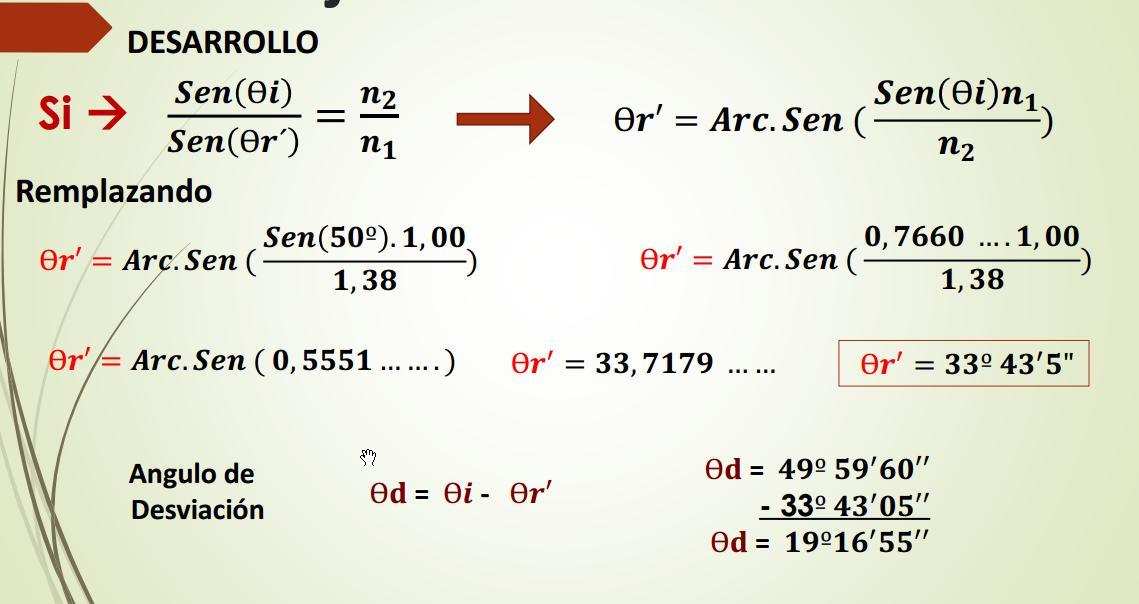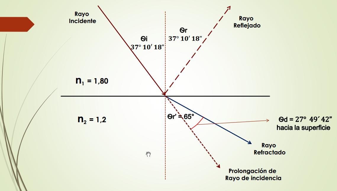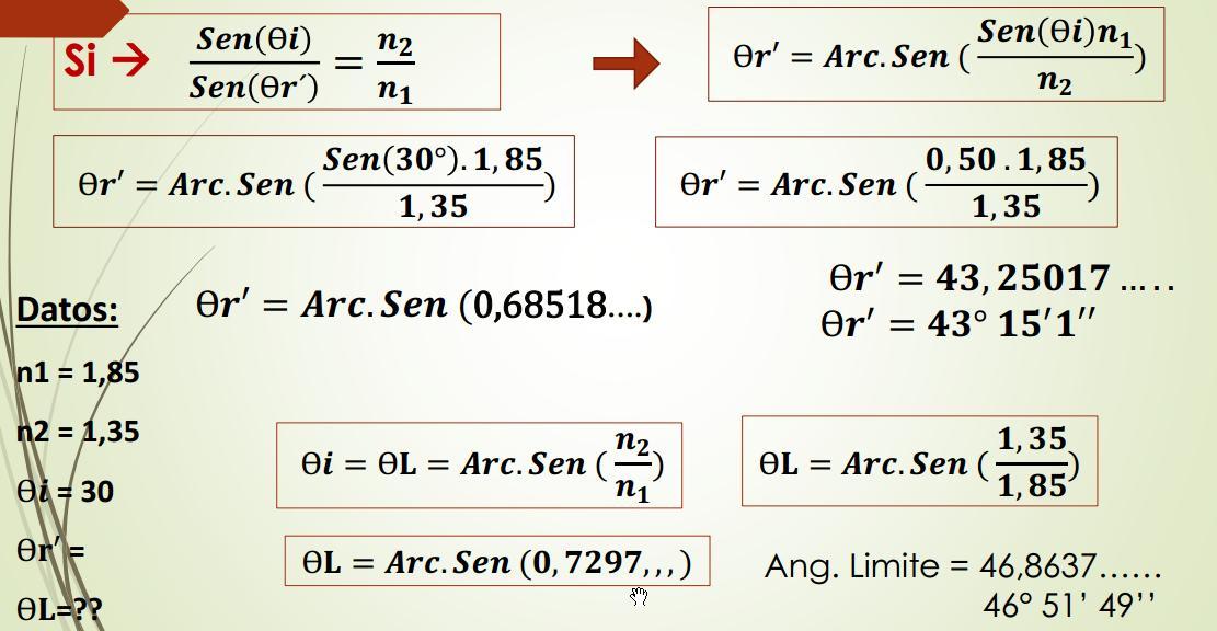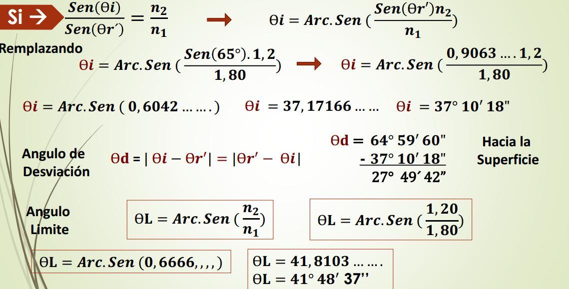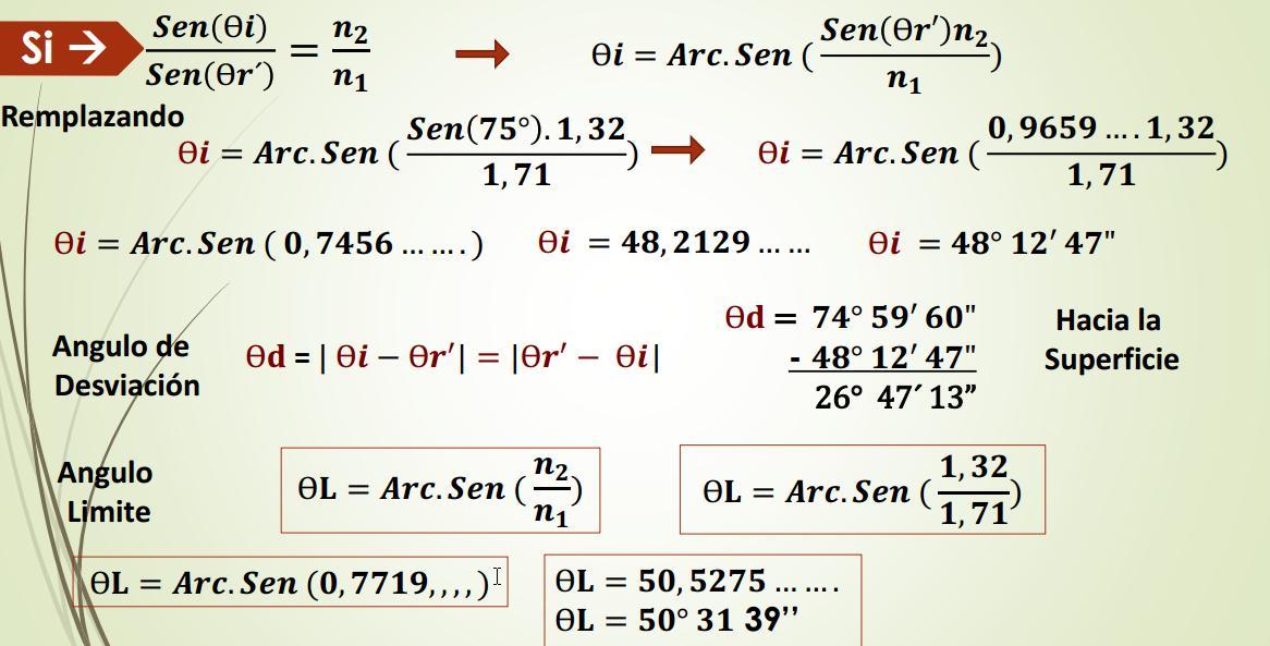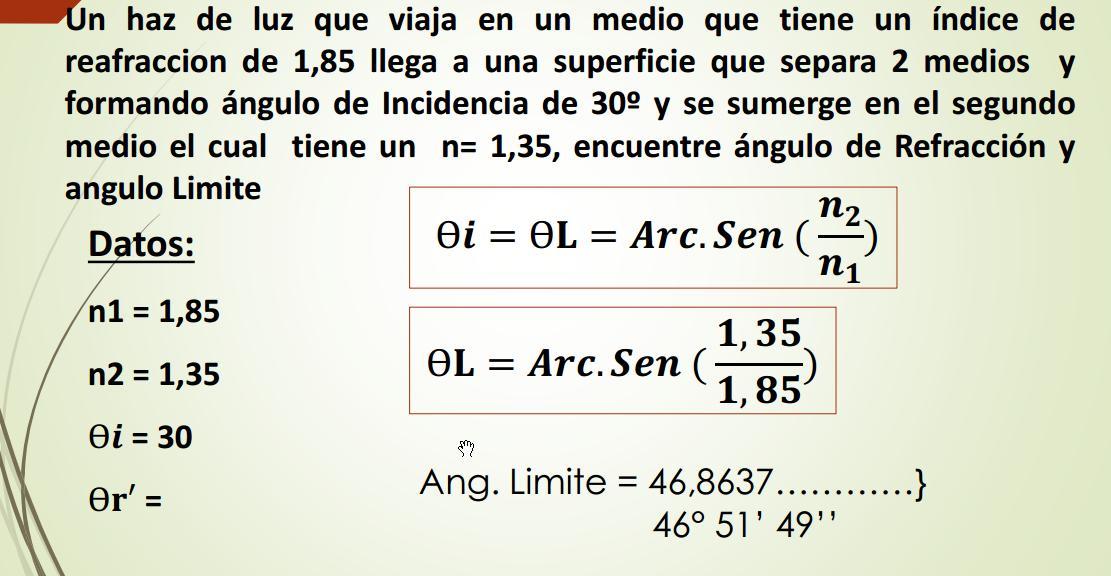 Rayo Incidente Rayo Reflejado Ѳr’ 43º 15’01’’ n2 = 1,35 Rayo Refractado Prolongación de Rayo de incidencia Angulo de Desviación Ѳd = 13º15’01’’ Ѳi = 30º Ѳr = 30º Angulo Limite O Angulo critico n1 = 1,85
