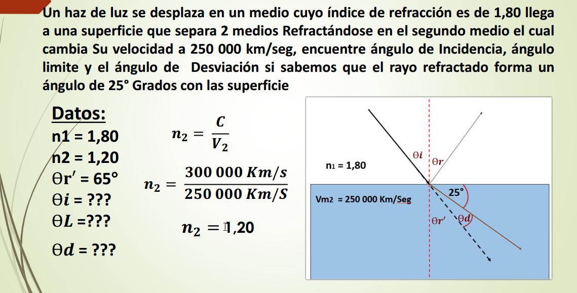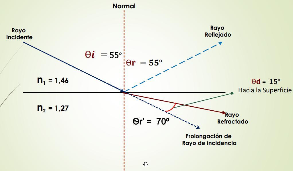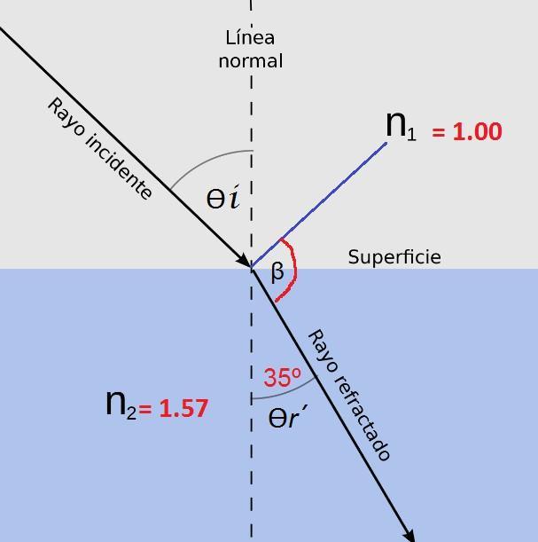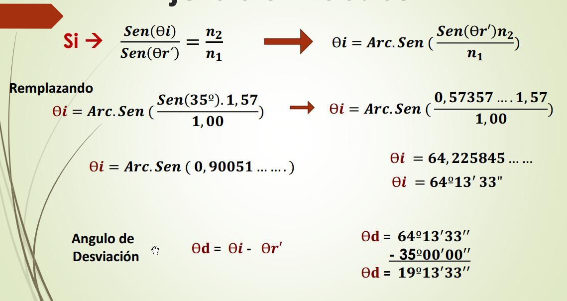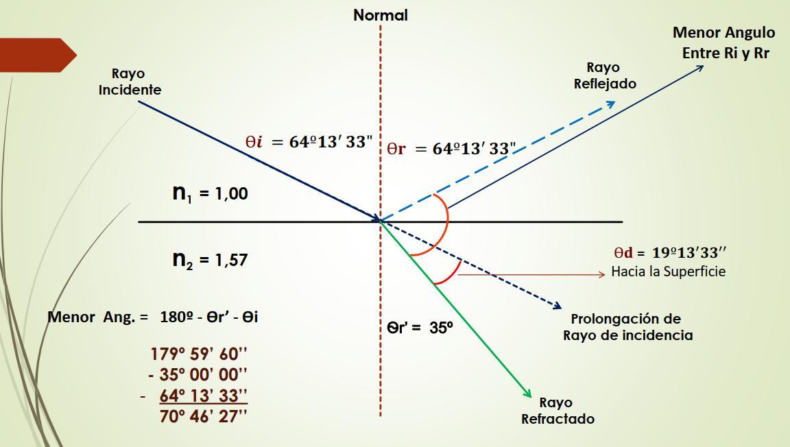 Ejercicio Practico Un haz de luz que viaja en el espacio llega a una superficie que separa 2 medios en y se sumerge en el segundo medio el cual tiene un índice de refracción de 1,57, formando un Angulo refracción de 35º encuentre ángulo de incidencia en el primer medio, el angulo de desviacion, el menor angulo que forma el Rayo feflejado con el rayo refractado Datos: n1 = 1.00 n2 = 1,57 Ѳ�� = ??? Ѳ��′ = 35º