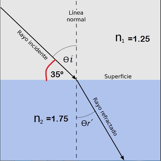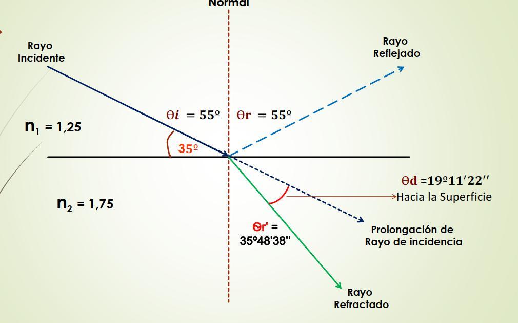 Ejercicio Practico 3 Una señal que viaja en un medio cuyo índice de refracción es de 1,25 llega a una superficie que separa 2 medios en y se sumerge en el segundo medio el cual tiene un índice de refracción de 1,75, formando un Angulo de 35º entre el rayo de incidencia y la superficie encuentre ángulo de Refracción y el Angulo de desviación Datos: n1 = 1,25 n2 = 1,75 Ѳ�� = 55º Ѳ��′ = ???