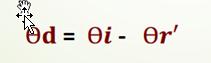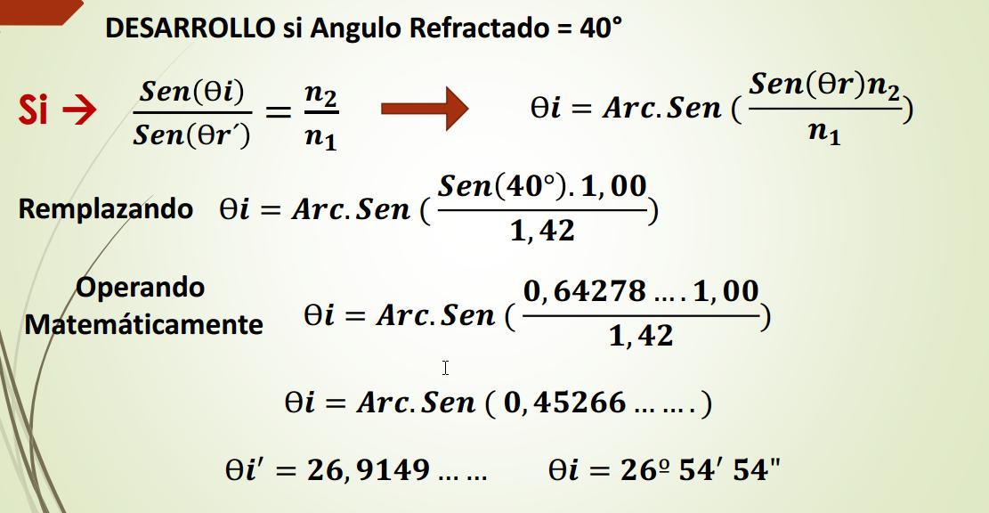 Rayo Incidente Rayo Reflejado n2 = 1,45 Ѳr’ 26º 18’53’’ Rayo Refractado Ѳr=40º Ѳi=40º n1 = 1,00 Prolongación de Rayo de incidencia Angulo de Desviación Ѳd = Ѳi -Ѳr’ Valor Absoluto