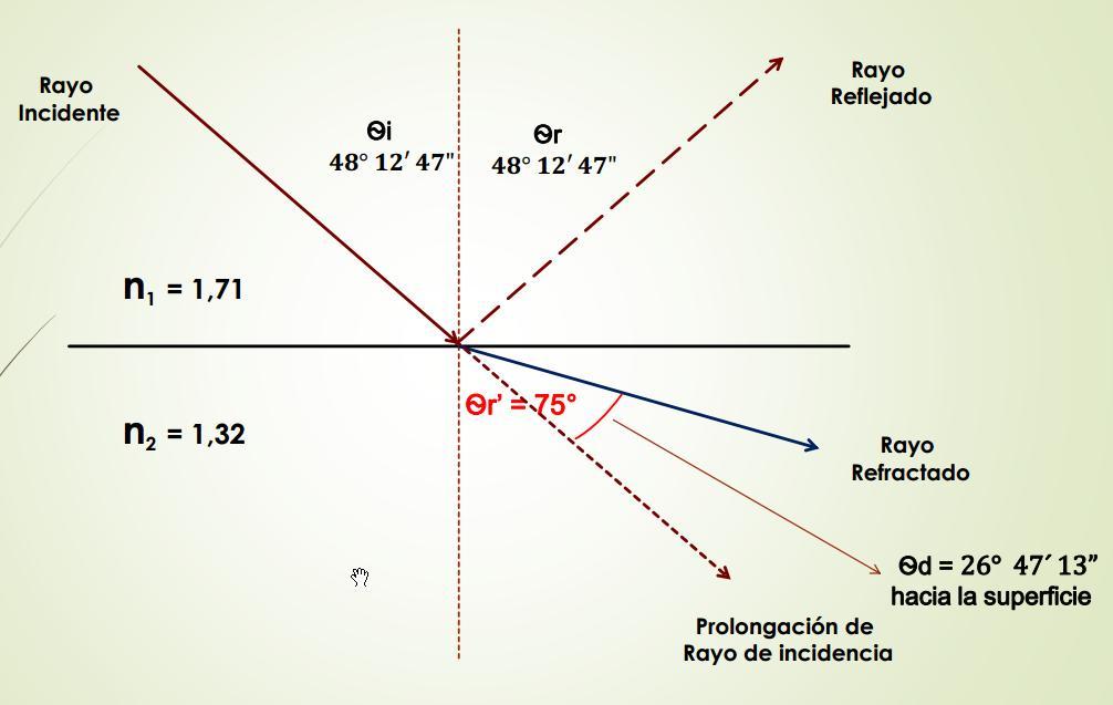 Rayo Incidente Rayo Reflejado n2 = 1,48 Ѳr’ 33º 43’5’’ Rayo Refractado Ѳr =50º Ѳi =50º n1 = 1,00 Prolongación de Rayo de incidencia Angulo de Desviación Ѳd = 16º19’55’’