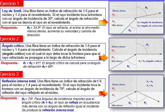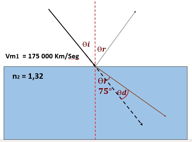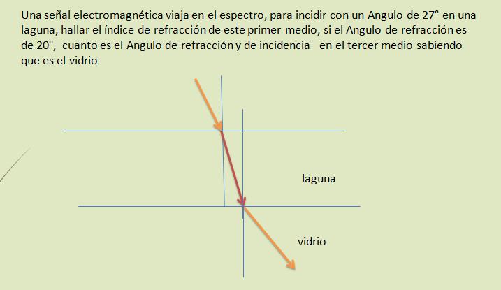 EJERCICIO . Se tiene una señal que pasa del AIRE hacia el agua, la señal incide con un ángulo de 45º, calcular el Angulo con que la señal se refracta. Y el angulo de reflexion