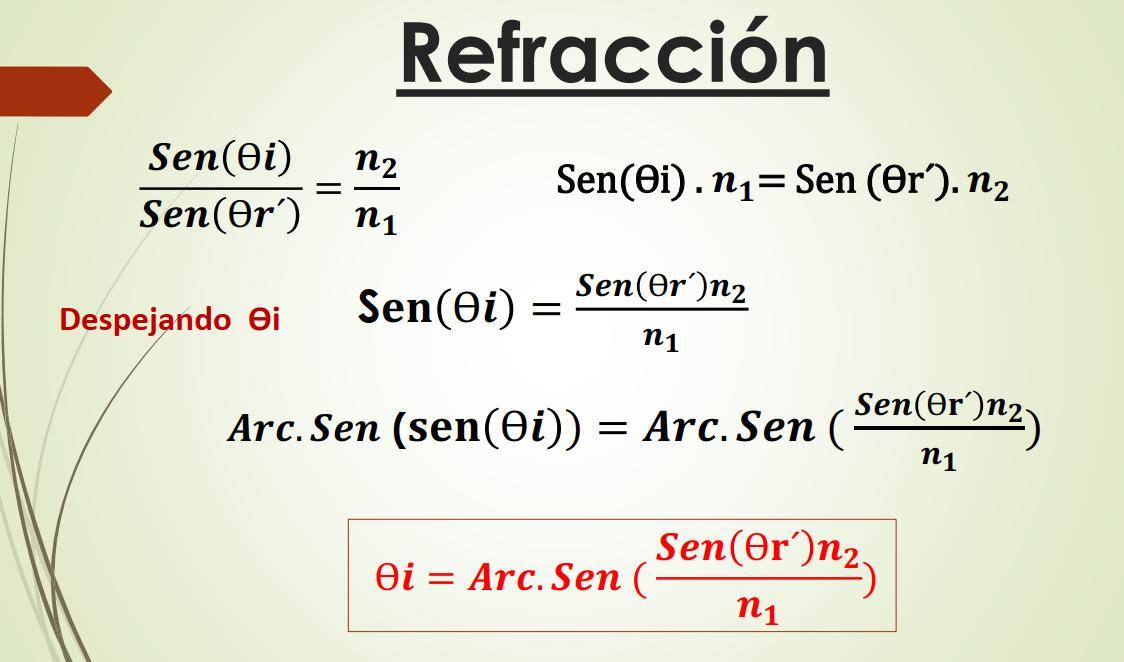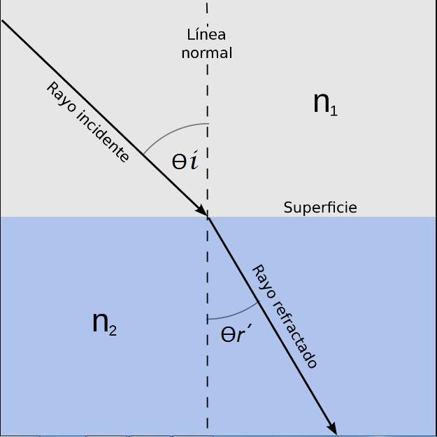 La refracción de la luz ocurre cuando esta pasa de un medio transparente con un determinado índice de refracción a otro, también transparente, con uno distinto. Se rige por dos principios o leyes de la refracción: 1. El rayo incidente, el refractado y la normal a la superficie en el punto de incidencia están en el mismo plano 2. La ley de Snell de la refracción, marca la relación entre el ángulo de incidencia Ѳi , el ángulo de refracción Ѳr ´ , y los índices de refracción de la luz en los medios 1 y 2, n1 y n2, respectivamente
