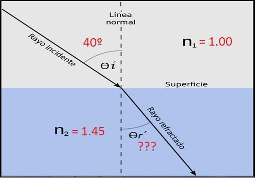 Ejercicio Practico 1 Una señal viaja en el espacio llega a una superficie que separa 2 medios en un ángulo de incidencia de 40º y se sumerge en el segundo medio el cual tiene un índice de refracción de 1,45, encuentre ángulo de refracción en el segundo medio Datos: n1 = 1.00 n2 = 1,45 Ѳ�� = 40º Ѳr′ = ???