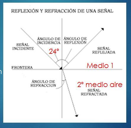 Una señal electromagnetica que se propaga en un medio con índice de refracción de 1.4 incide sobre el aire con un ángulo de 24º. ¿Qué ángulo forman entre sí los rayos reflejado y refractado?