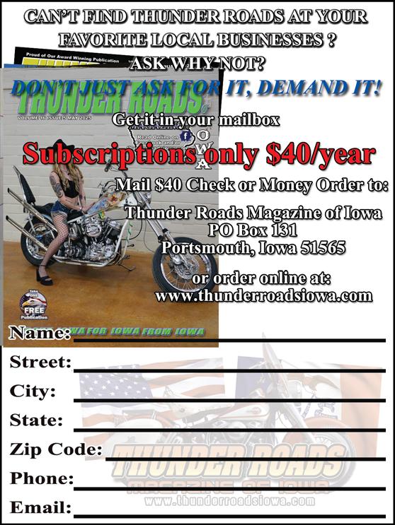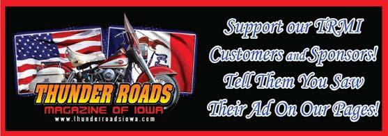 Before parting ways for the month, remember to try and darken the door of places you see on these pages. We thank them for their loyal support of Thunder Roads Magazine of Iowa and greatly appreciate their support, as we could not do this without them. Check out their places of business, and let them know TRMI sent ya!