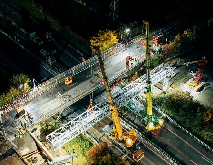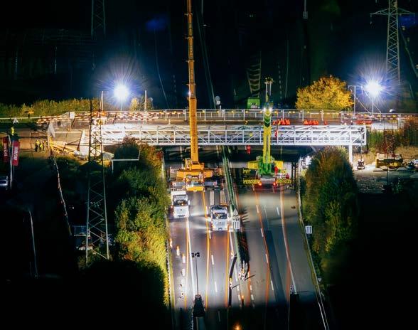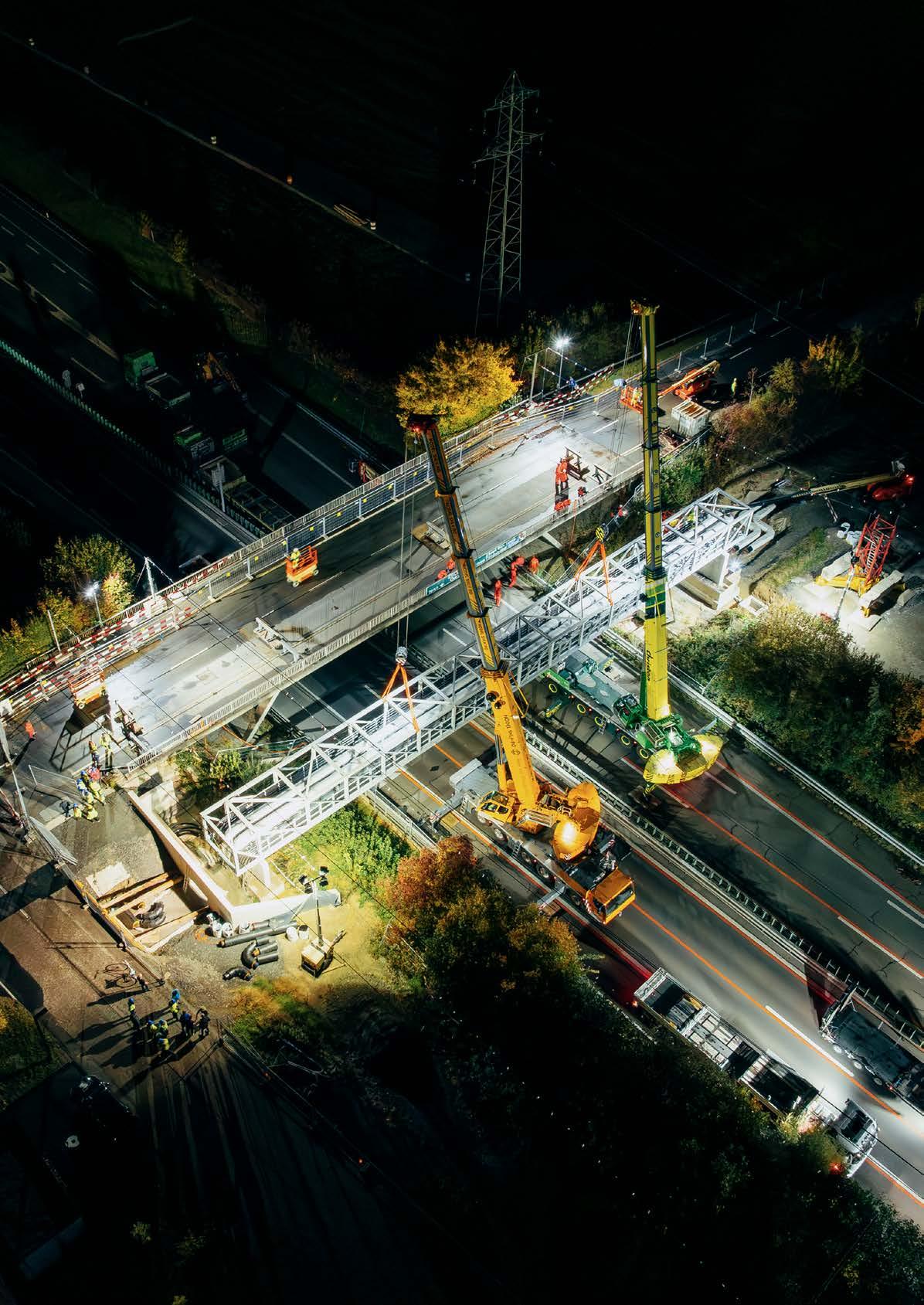 Drohnenaufnahme des nächtlichen Einhubs der Rohrbrücke in Rotkreuz mit Spezialkranen.