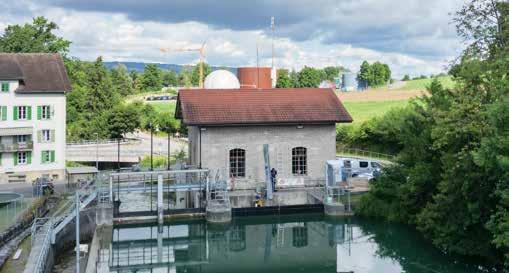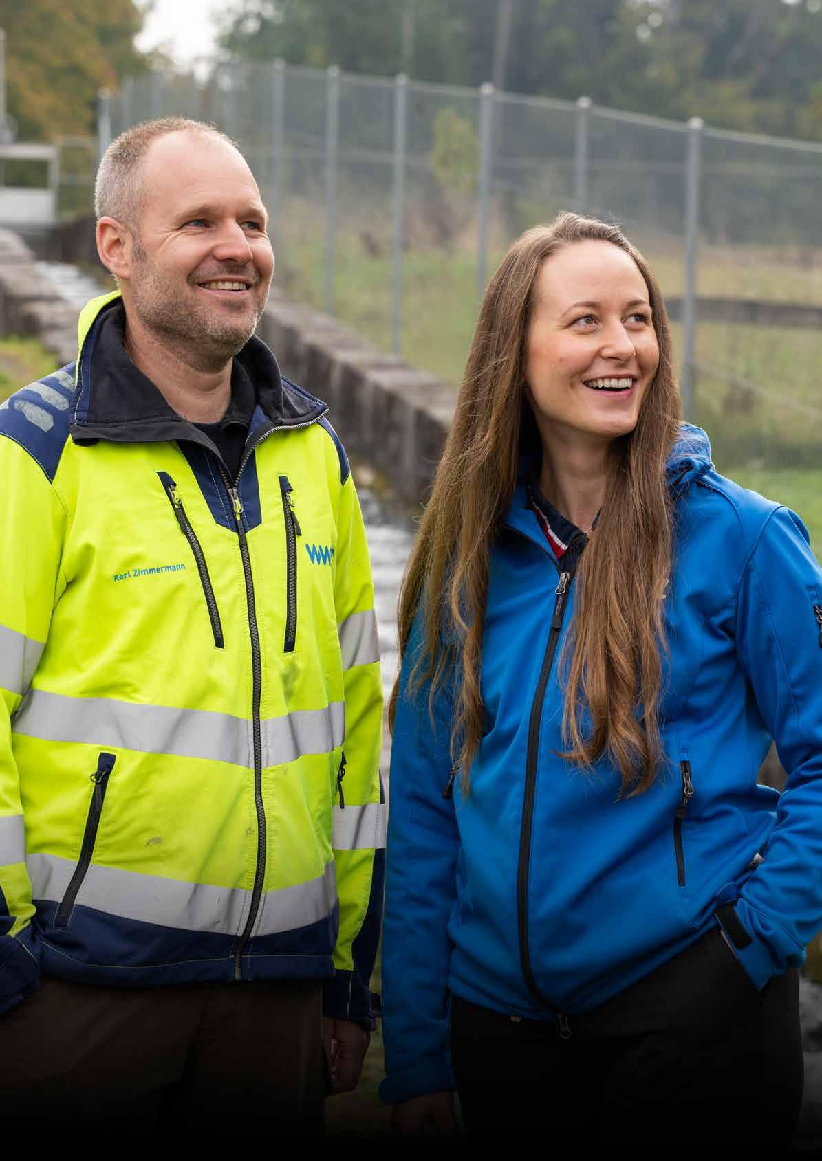 Titelseite: Mitarbeitende beim Wasserkraftwerk Untermühle, wo WWZ regionale erneuerbare Energie produziert