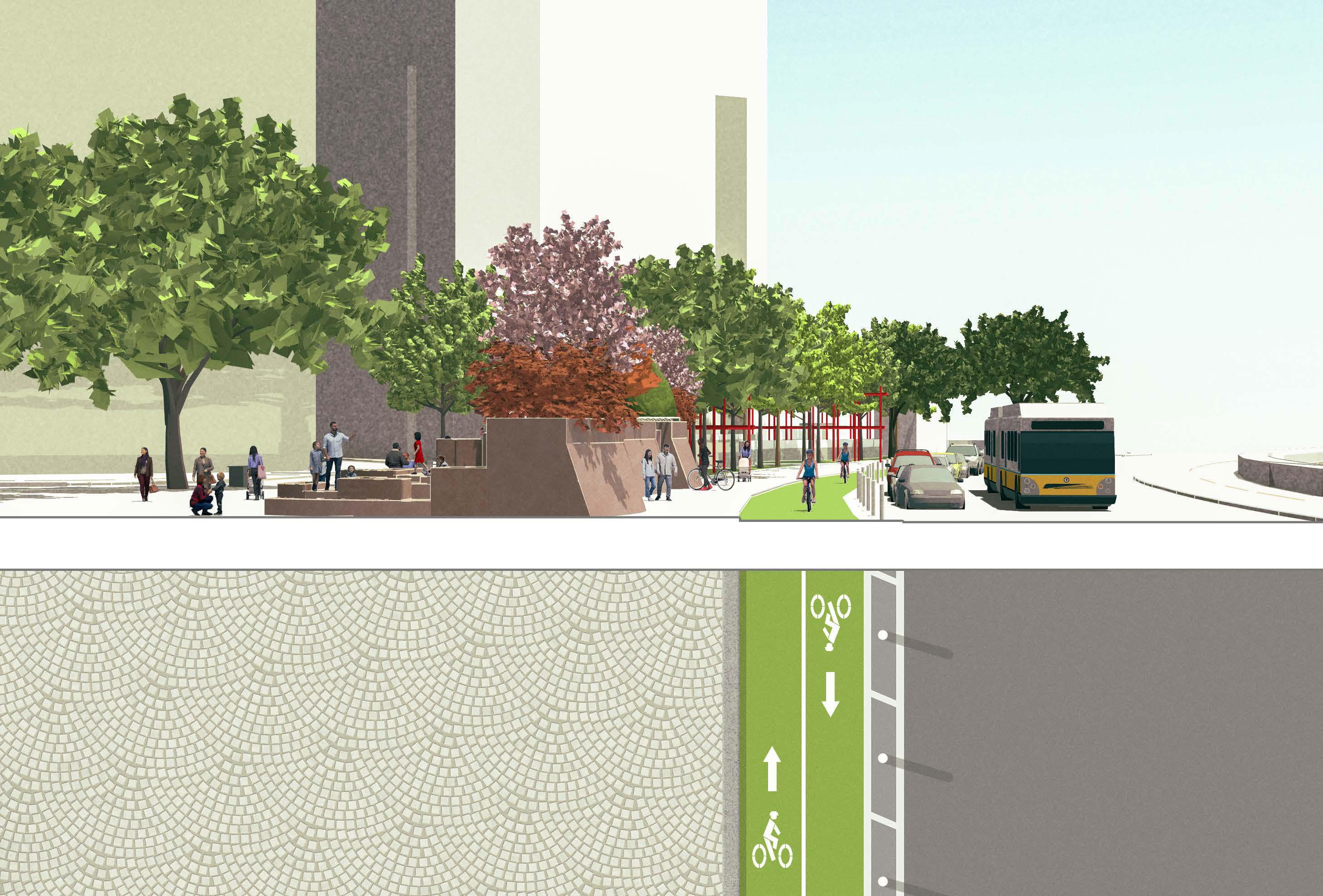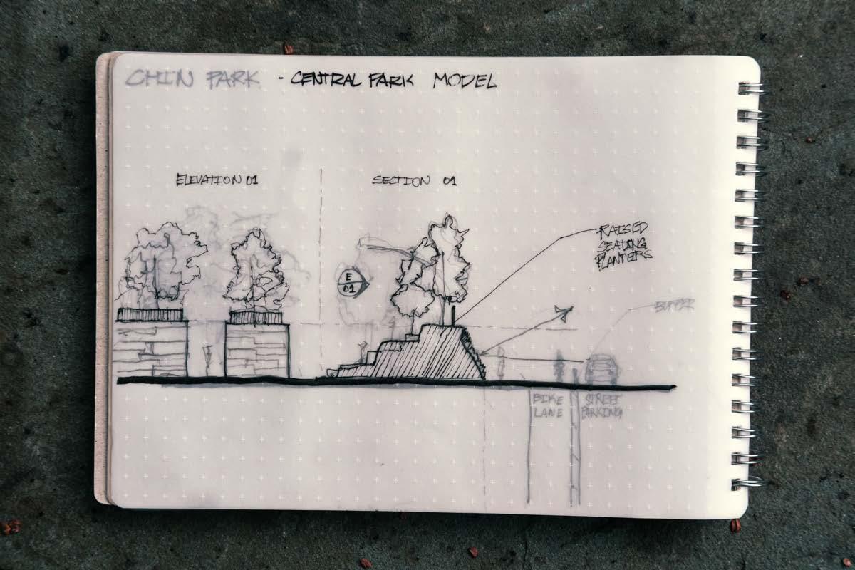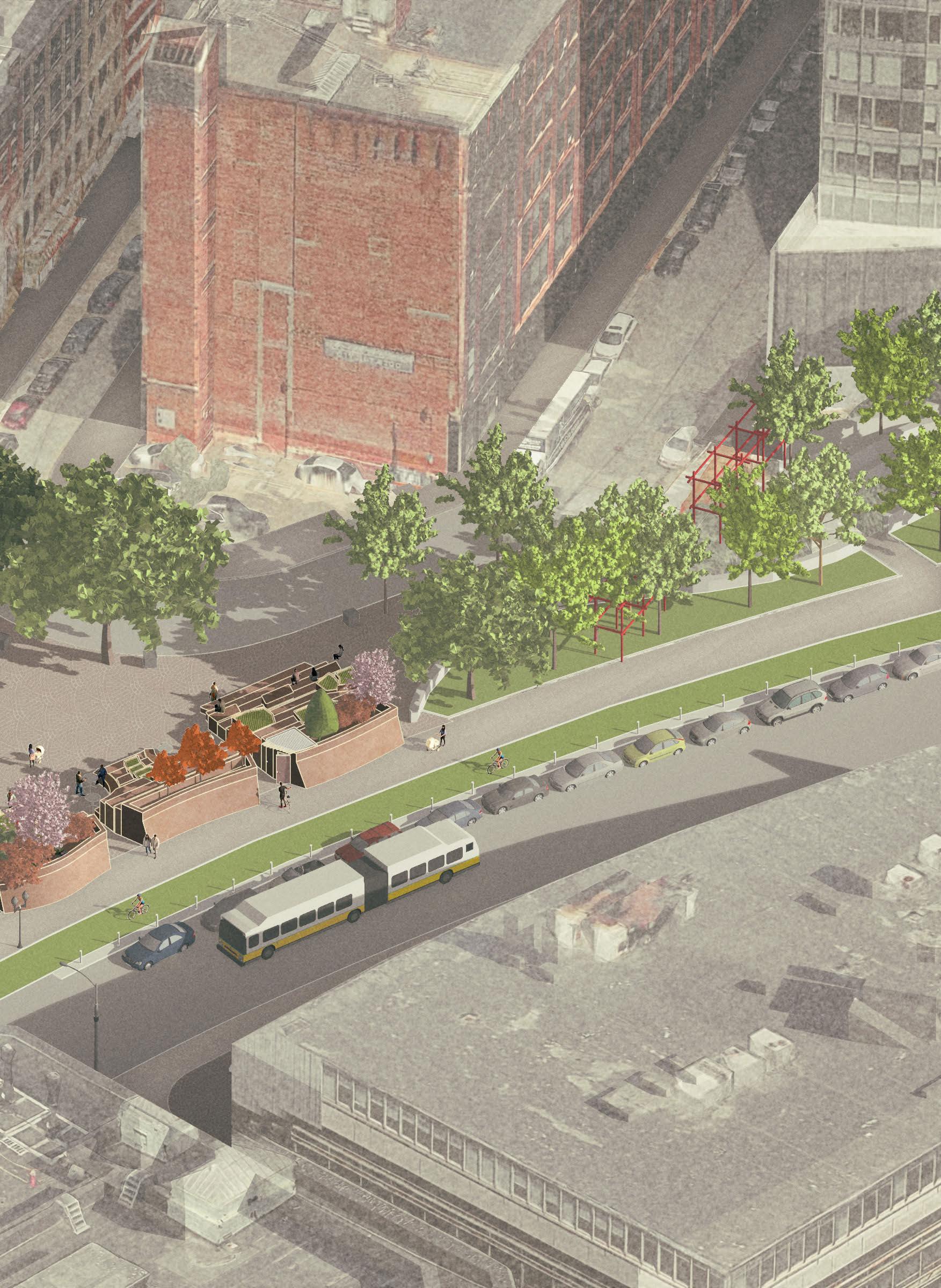 The adjacent arterial road is reimagined with only two lanes of one-way traffc, rather than the previous three. To further protect pedestrians and park-goers, the road gains a double bike lane protected with street parking (in alignment with Boston’s Complete Street Guidelines).