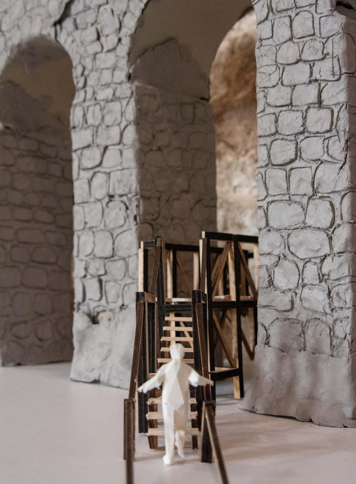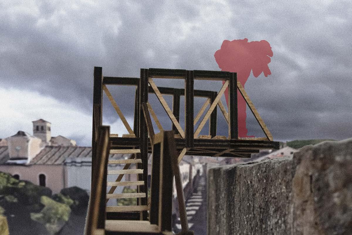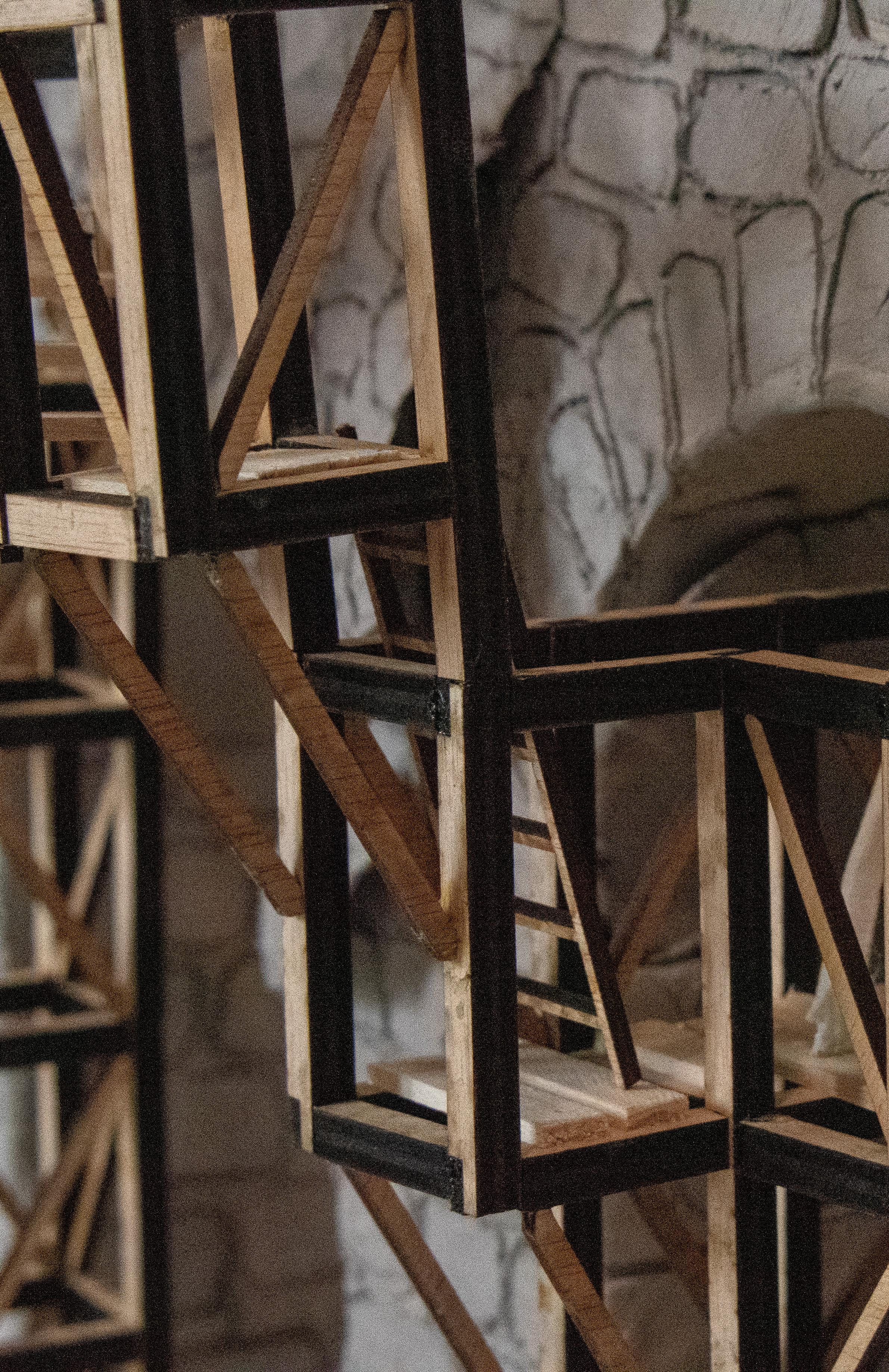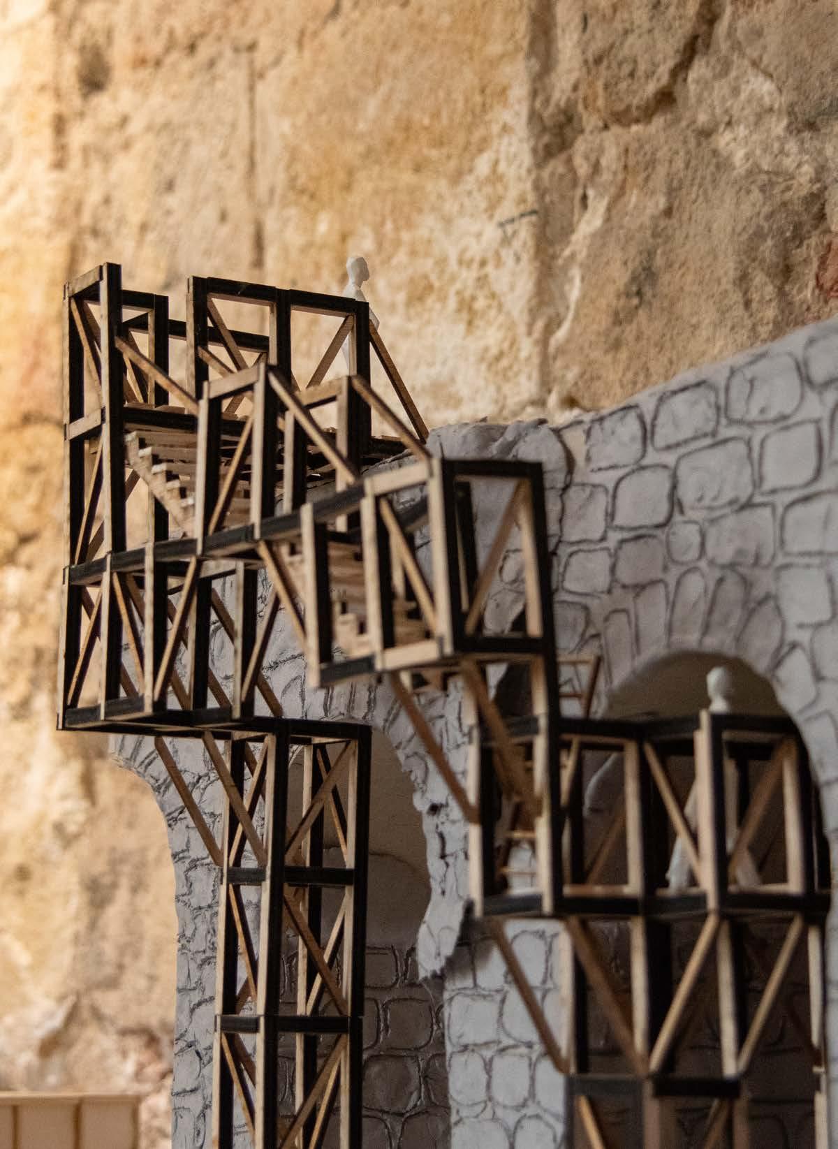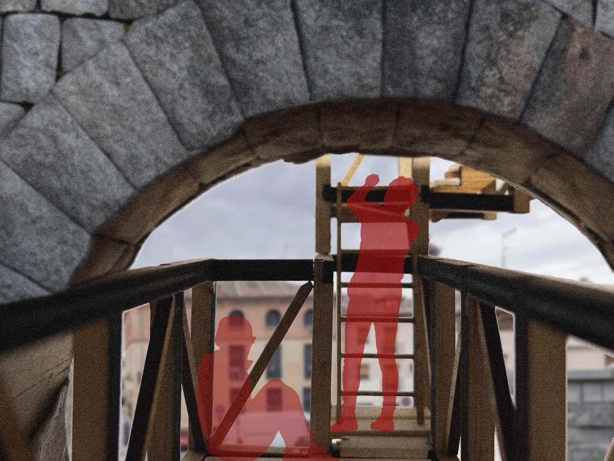 The modularity of the case study is applied to the structure’s construction. To climb up the aqueduct, modules consisting of trussed arches and platforms alternate all the way to the top of the aqueduct.