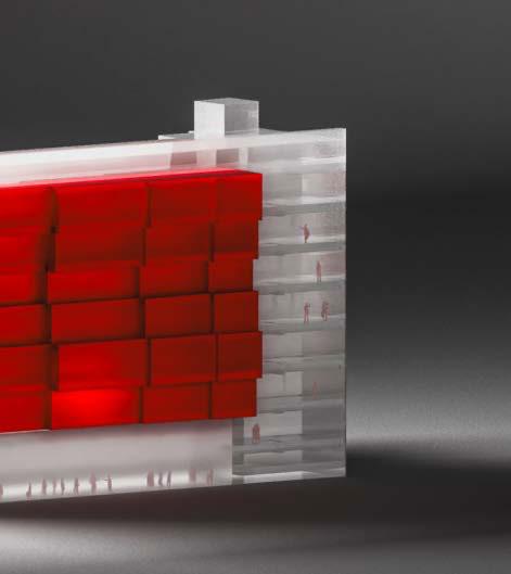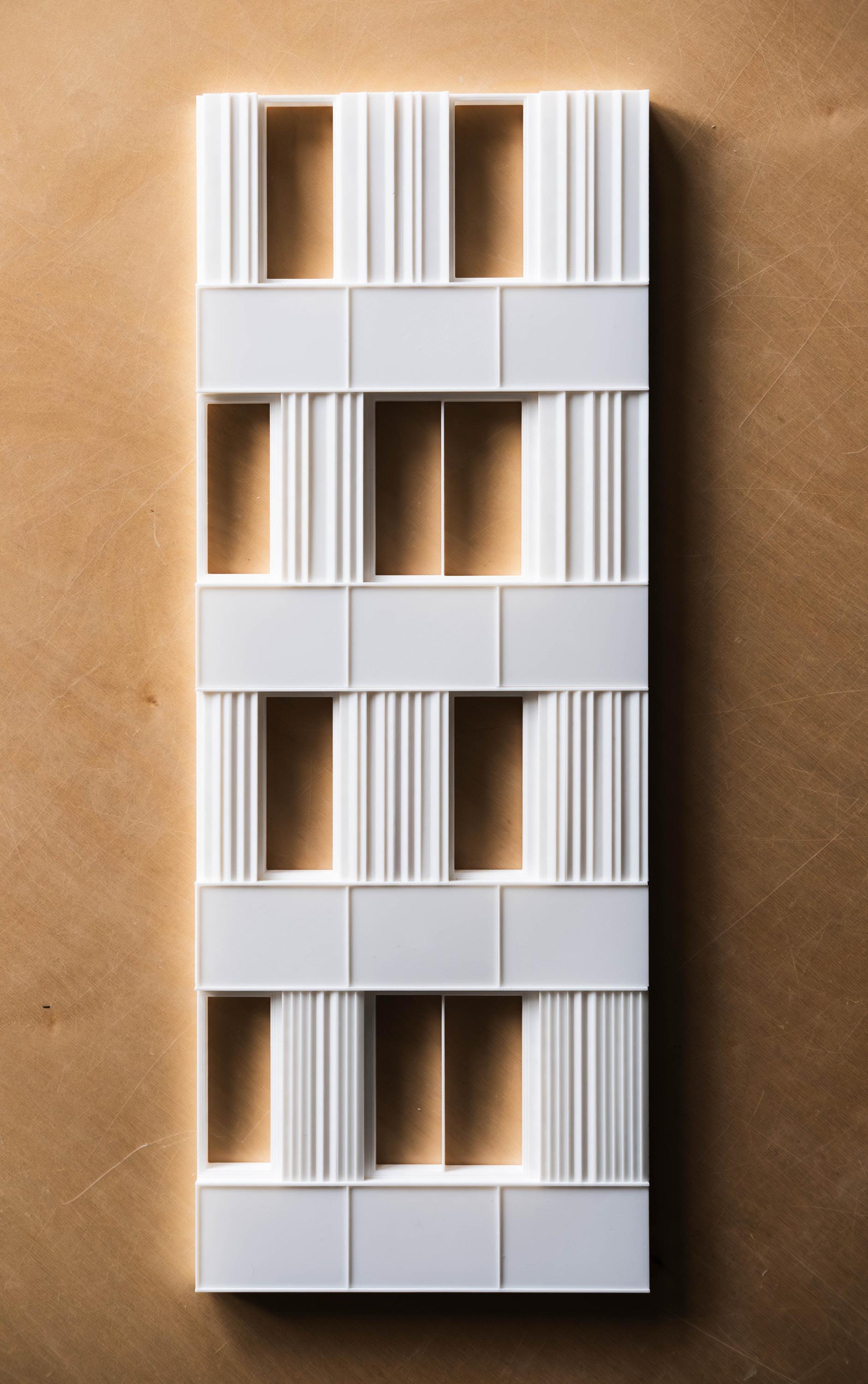 tessellated in repeating combinations of three. The lower foors employed the busiest profles, decreasing in textural density with every subsequent foor. This resulted in a seamless, organic gradient of texture while still optimized in cost and assembly, only requiring four types of panels.