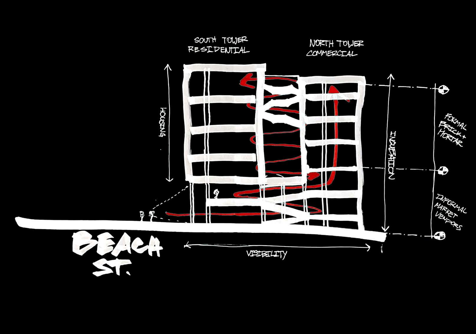 The converted garage’s central location centralizes a phased cyclical greening operation. Street vendors become market vendors, afforded the space and facilities to both grow and sell their produce.