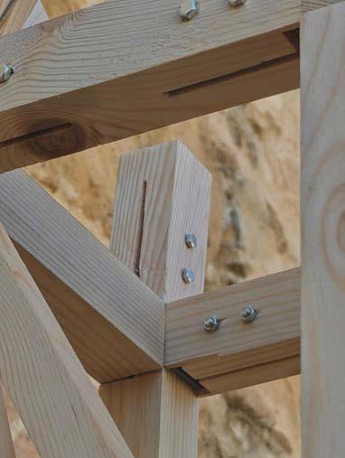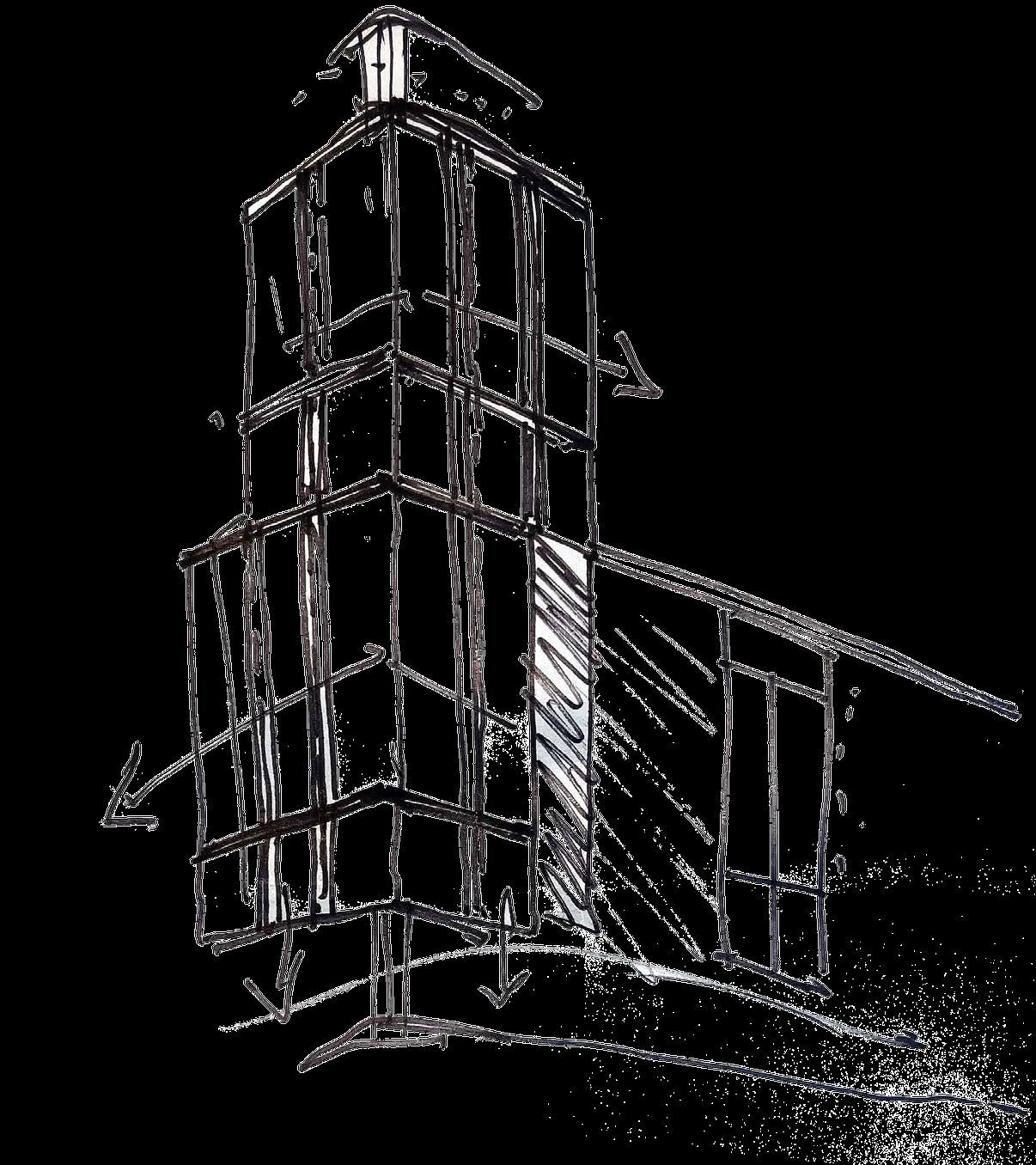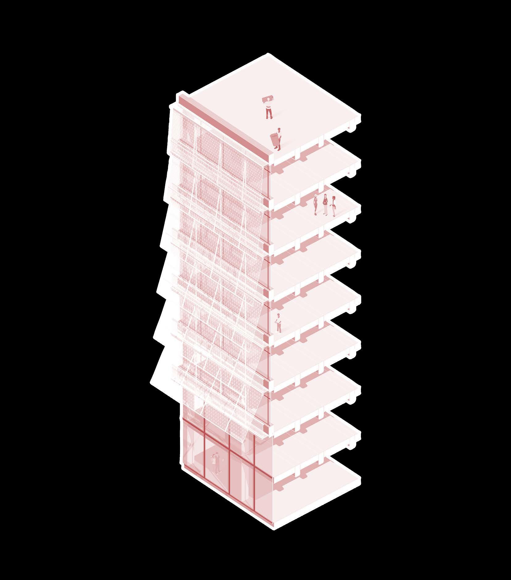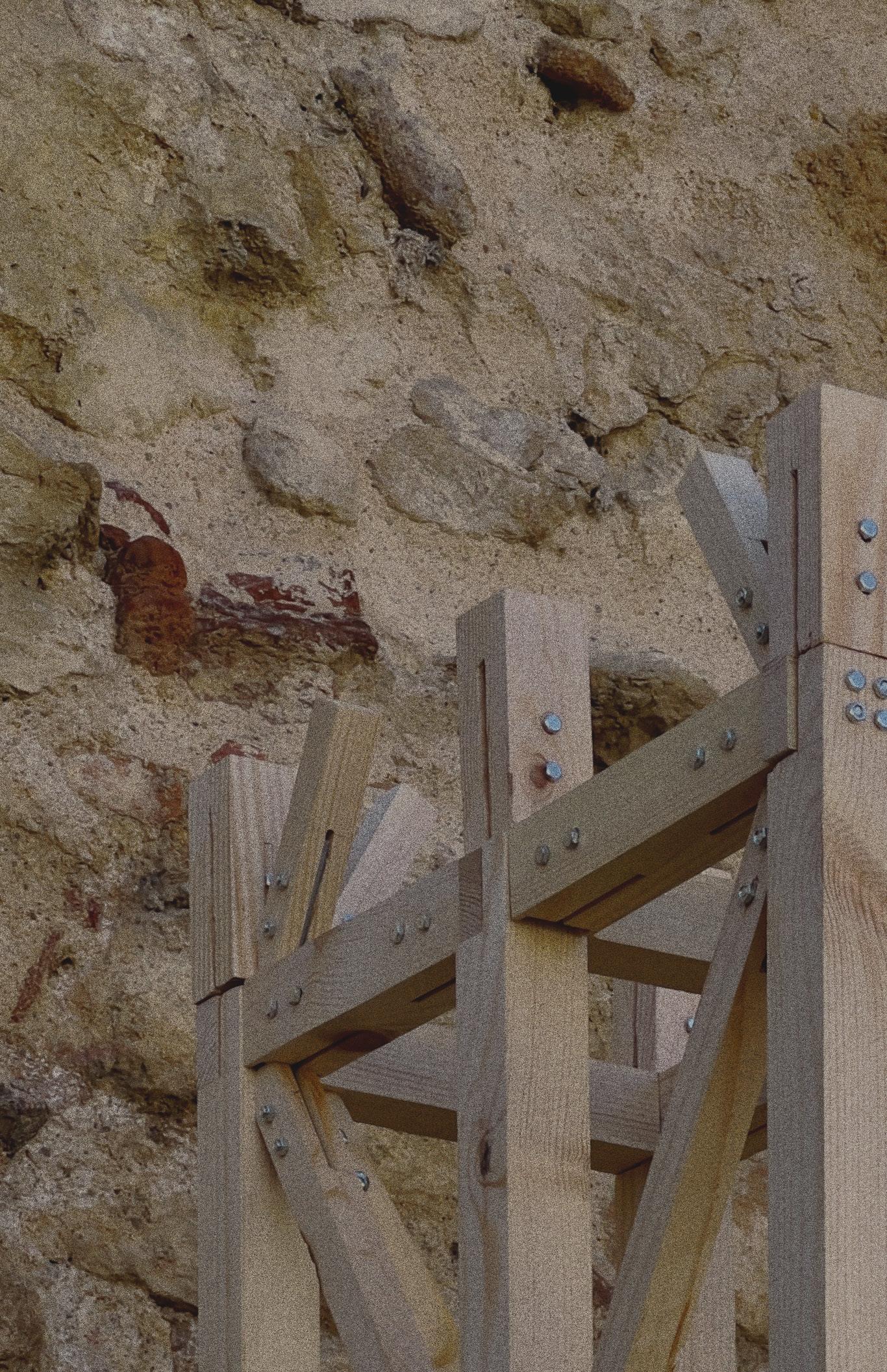 Merola’s Tower construction consists of spruce and douglas fr bilaminated glulam scaffolding modules stacked and connected together via a variety of steel knife plate connections. These modules are constructed off-site and then placed atop one another via crane. Like scaffolding, it structurally stabilizes and reflls the volume of the pre-existing construction.