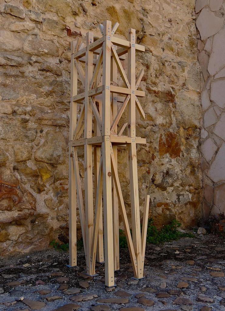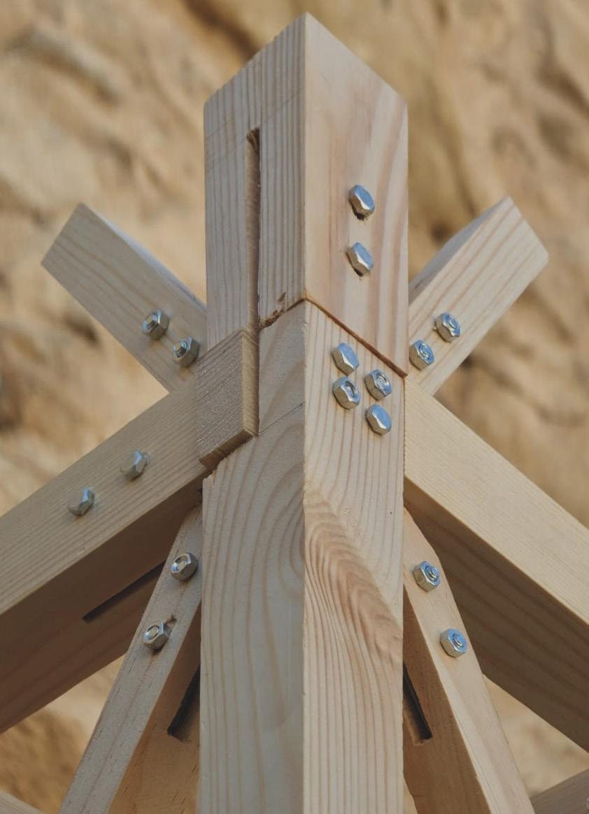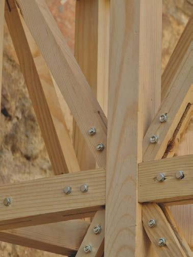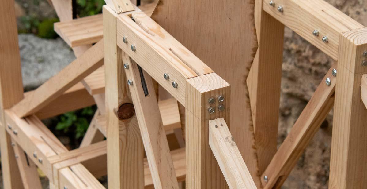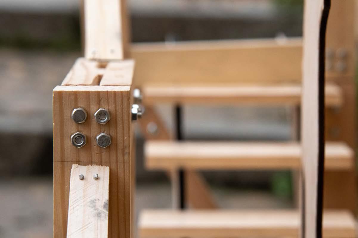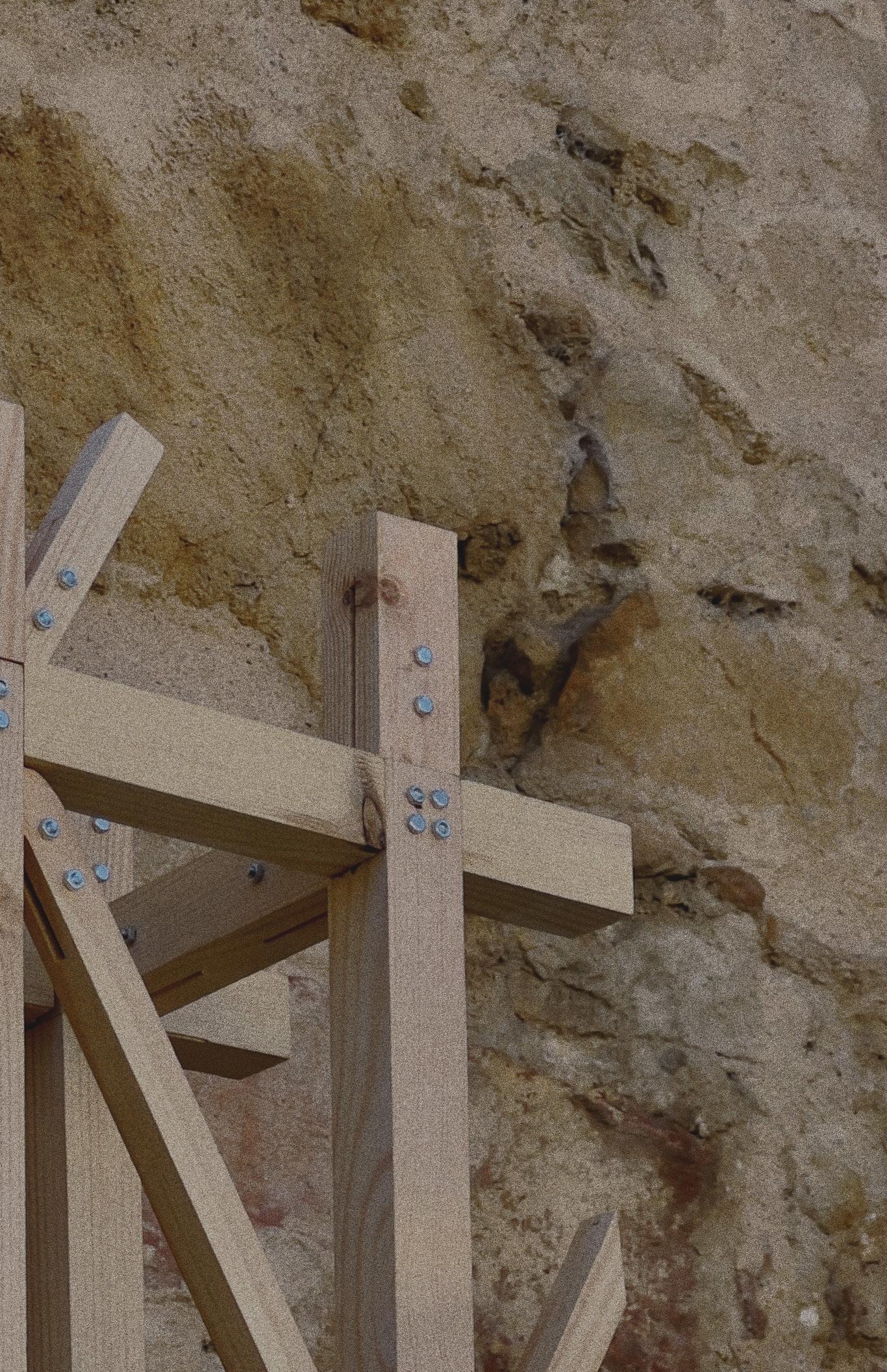Merola’s Tower construction consists of spruce and douglas fr bilaminated glulam scaffolding modules stacked and connected together via a variety of steel knife plate connections. These modules are constructed off-site and then placed atop one another via crane. Like scaffolding, it structurally stabilizes and reflls the volume of the pre-existing construction.