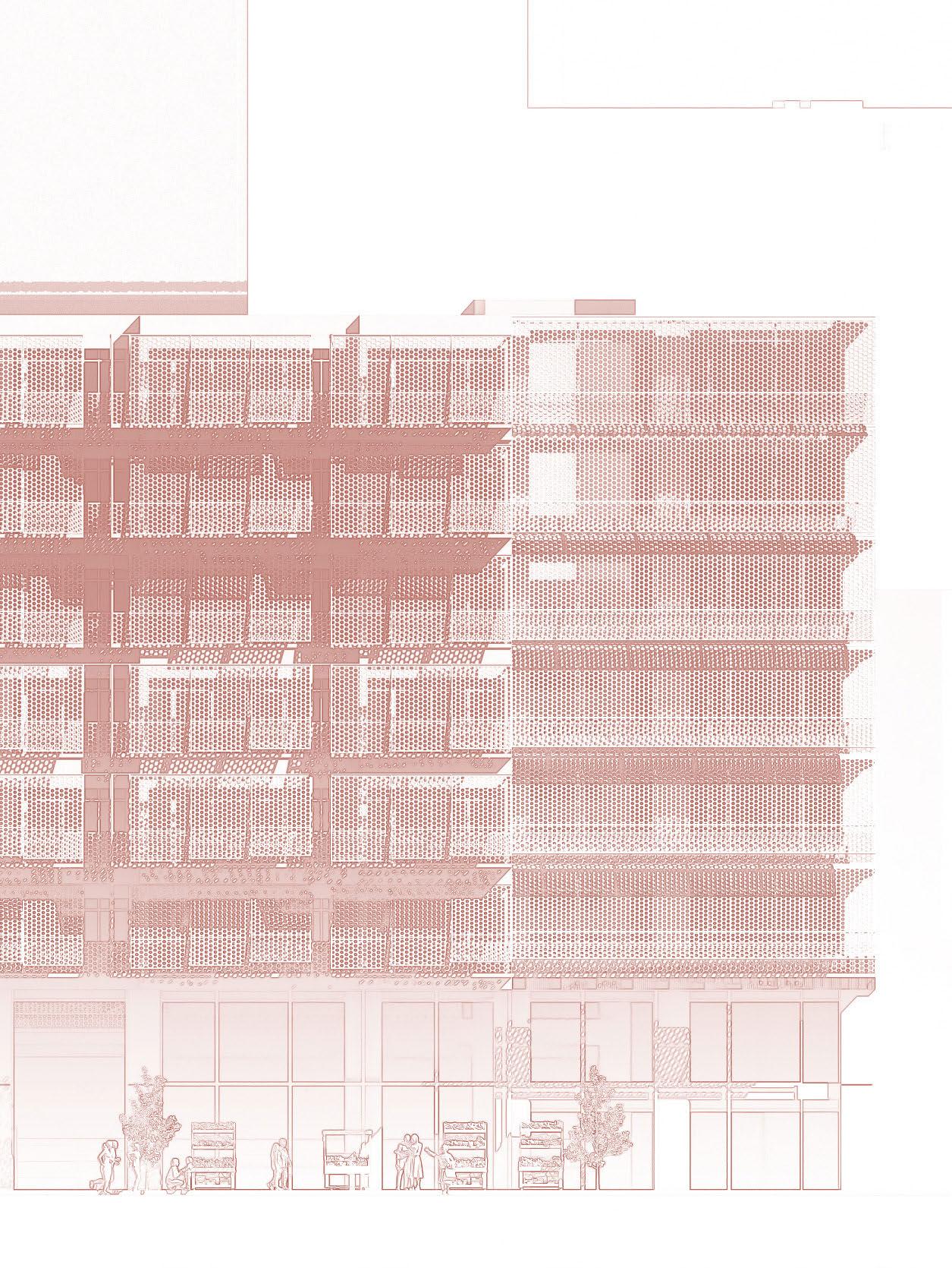 Pedestrianizing streets enables the transformation of infrastructure originally constructed to serve an automobile society into solutions for the 21st century. For instance, this eightstory parking structure is retroftted to hold twenty-four housing units, an open-air ground foor community space, public produce garden, and rentable space for small businesses to grow.