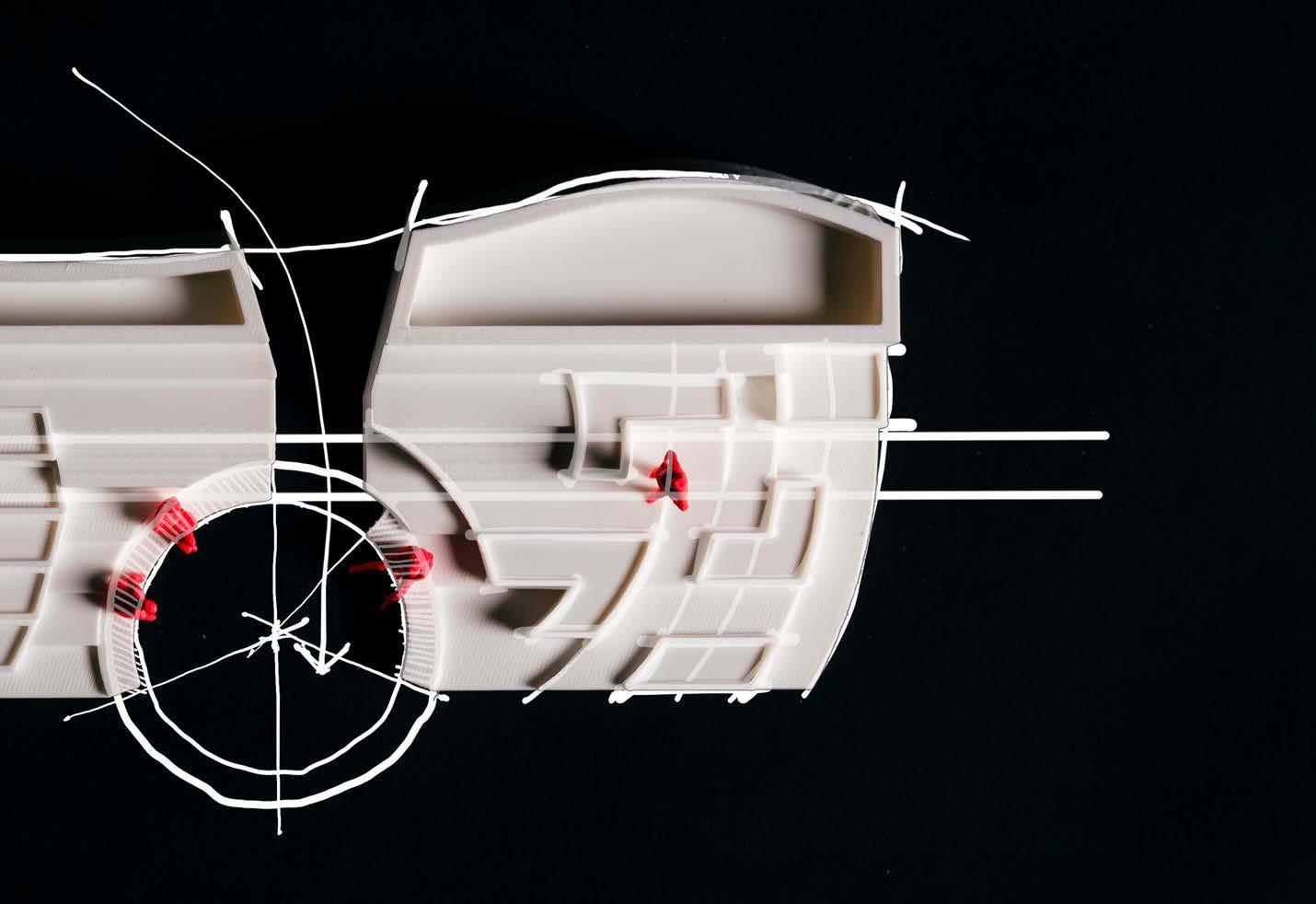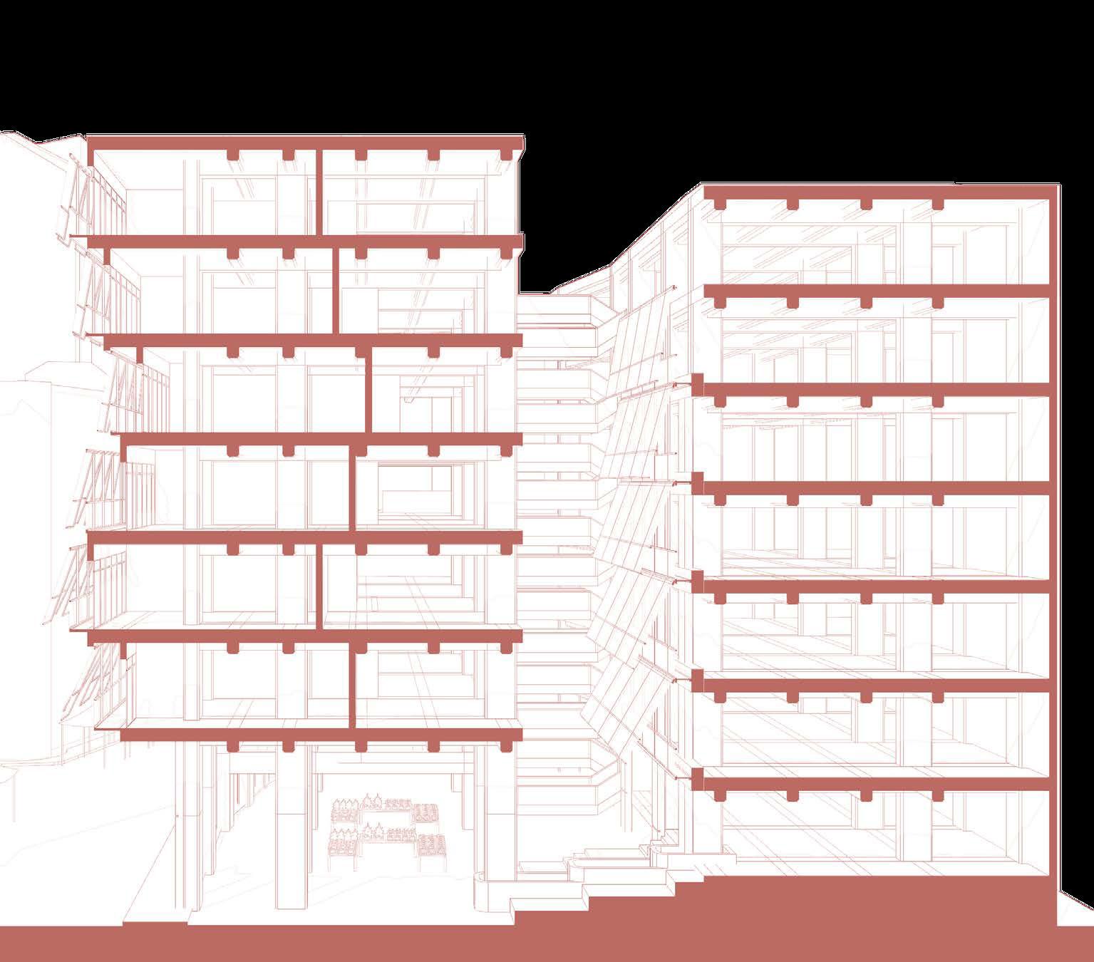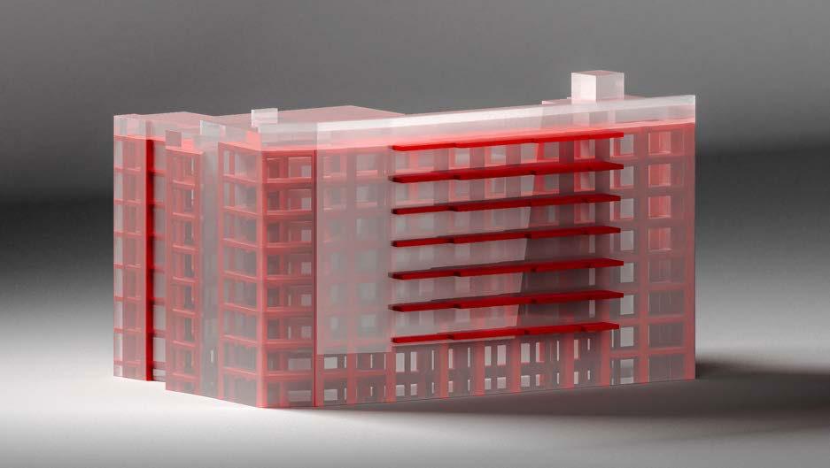 Design began with thorough archival research and feld verifcation of the existing structural systems, revealing a framework for surgical vertical and horizontal massing subtractions without compromising tributary or load-bearing members.