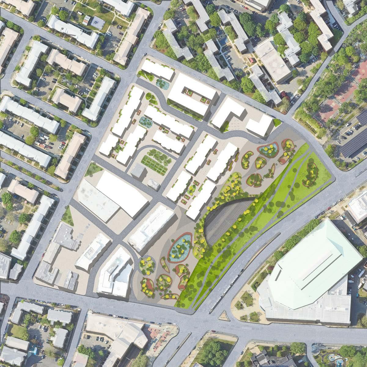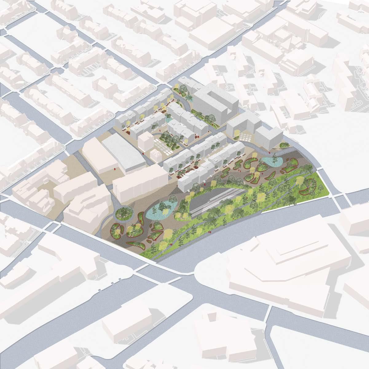 Small blocks of four-story rowhouses form alleys and lanes flled with landscaping, seating, and public infrastructure like playgrounds and community gardens. These medium density homes naturally ft in with the surrounding vernacular developments. Rowhouses are offset to create alternating front and back gardens and stoops. Interior streets slow traffc, with coplanar paving to blur the boundaries of the pedestrian realm.