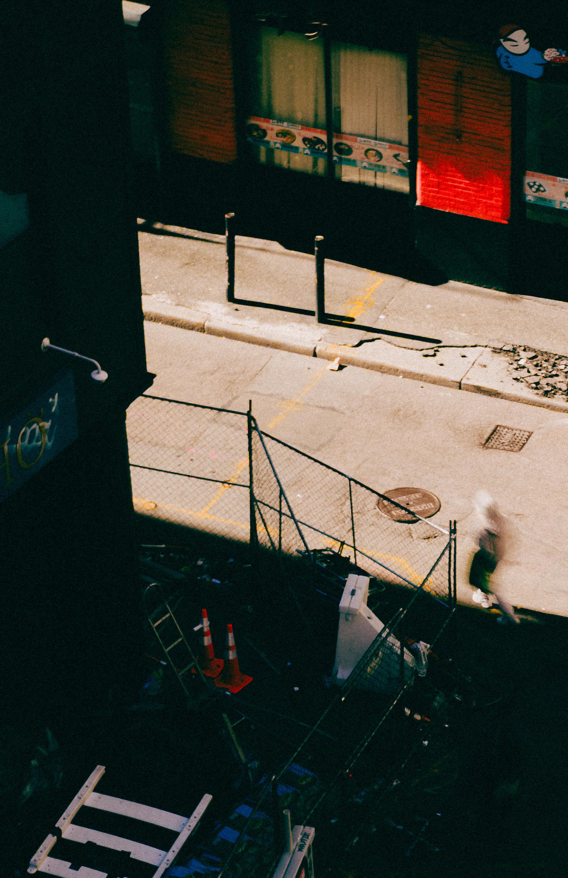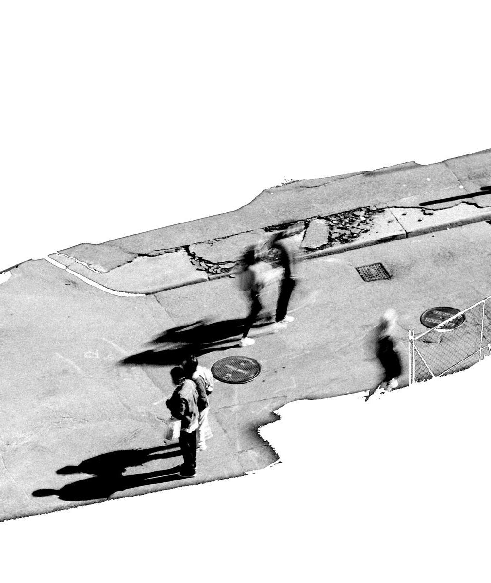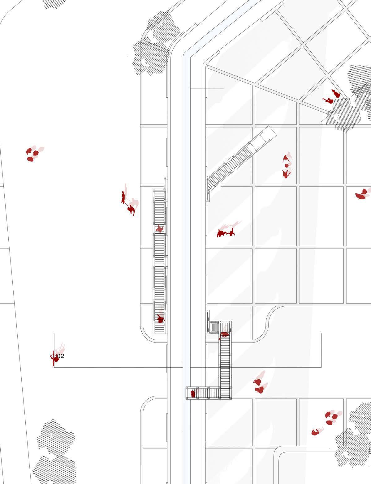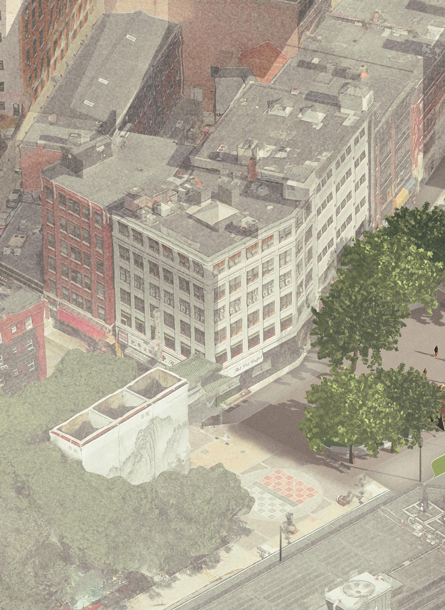 air quality, noise, and road hazards. What if that were to change? This speculative project pedestrianizes several Chinatown streets, closing them off to cars completely, allowing life in the public realm to expand. Furthermore, surface parking lots undergo phased tactical urbanism, transforming from urban scars of asphalt to a network of pocket parks.