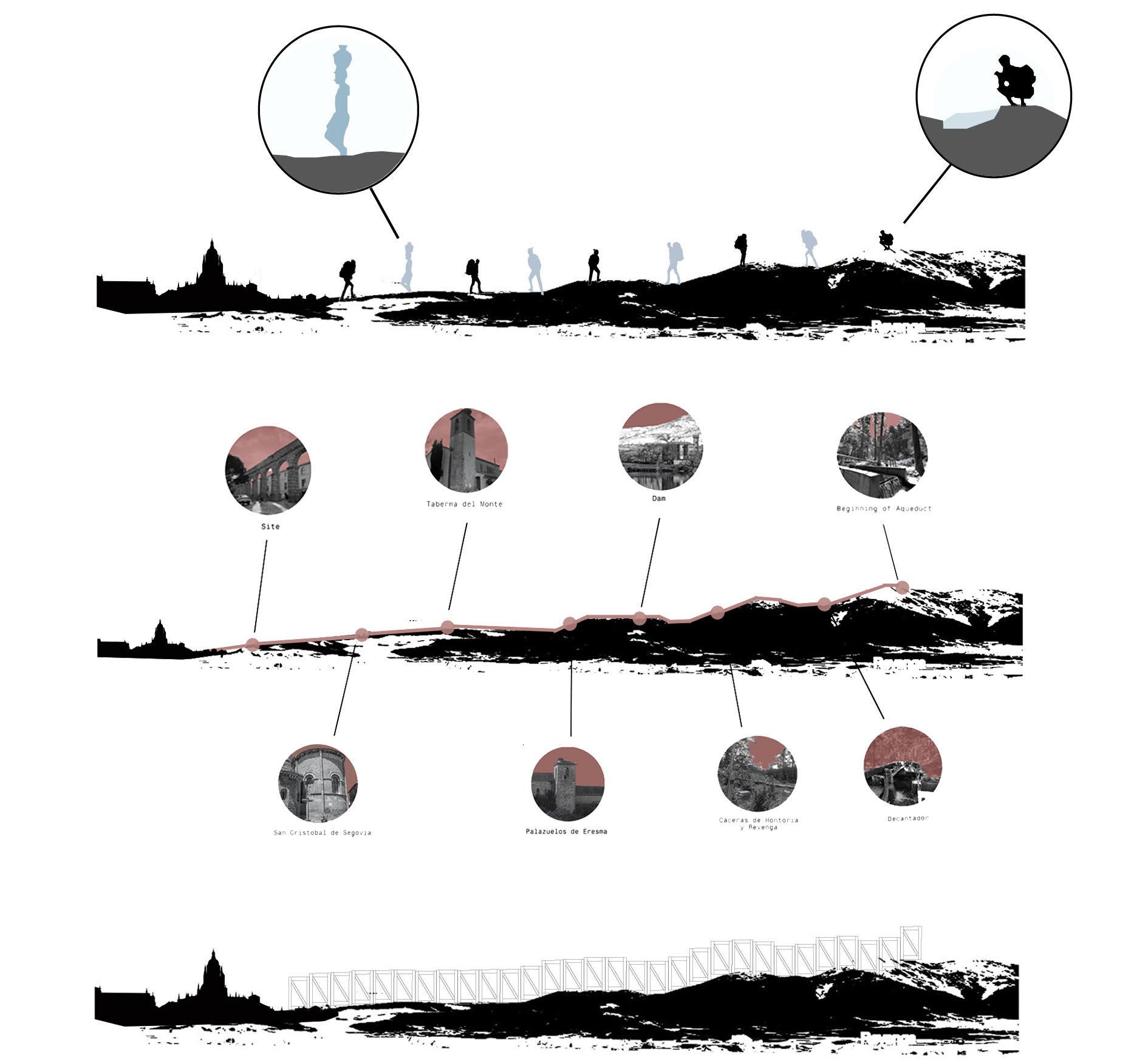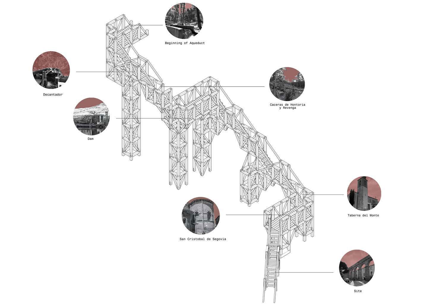 The Roman Aqueduct in Segovia spans over 16 kilometers, carrying water from the deltas of the nearby mountain to the historic town on a hill. Our team tasked ourselves with designing a structure that reveals the path of the mountain to the Old Town of Segovia. We sought to design an elegant solution that celebrates the history of the aqueduct and the techniques and materials of Merola’s Tower.