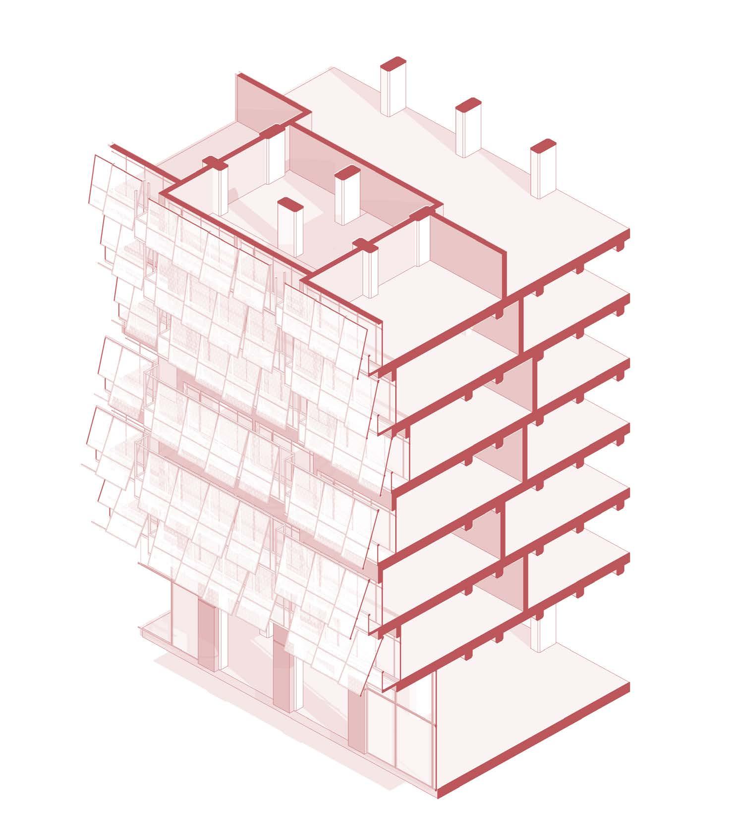 Operable trellises are layered onto the facade, providing surfaces for climbing plant species to grow and cool the interior during summer months.