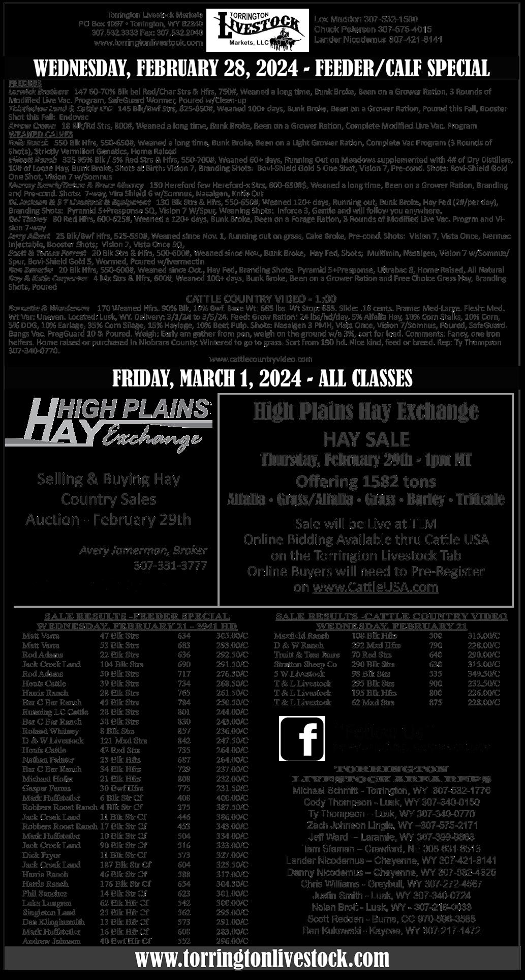 31 OBSIDIAN DNAMITE 845 02-24-2023 • AAA #20642380 PAP: 39 • BW: 72 # • 205-848 # • EFF: 75% CED: 10 Birth: -.5 WW: +76 Yearling: +136 • Milk +30 • $M: +57 • $W: +74 $F: +116 $G: +64 $B +180 $C +290 LOT 24 AND DAM OBSIDIAN FAST FORWARD 836 02-09-2023 • AAA #20642371 PAP: 35 • BW: 94 # • 205-876 # • EFF: 89% CED: +0 Birth: +2.9 WW: +67 Yearling: +109 • Milk +29 • $M: +71 • $W: +69 $F: +85 $G: +56 $B +140 $C +253 LOT 22 AND DAM OBSIDIAN BOMBER 832 02-04-2023 • AAA #20648690 PAP: 38 BW: 86 # 205-854 # EFF: 83% CED: +3 • Birth: +.7 • WW: +90 Yearling +154 Milk +20 $M: +56 $W: +77 $F: +126 • $G: +71 • $B +197 • $C +312 1490 South 8th Street East • Riverton, WY 82501 • (307) 856-2209 Tuesday, February 20 Market Report • 1,305 Head Sold RIVERTON LIVESTOCK AUCTION Contact: Riverton Livestock Auction (307) 856-2209 • Jeff Brown (307) 850-4193 • Tom Linn (307) 728-8519 • Mark Winter (580) 747-9436 www.rivertonlivestock.com • Also watch our live cattle auction at www.cattleusa.com Representative Sales Early Consignments TUESDAY, FEBRUARY 27 ALL CATTLE CLASSES W/ SHEEP & HORSES START TIME 9:00 AM W/ SHEEP & WEIGH UP FEEDER SPECIAL START TIME 9:00 AM WEIGH UPS TUESDAY, MARCH 19 ALL CATTLE CLASSES W/ SHEEP & HORSES 46TH ANNUAL NORTHWEST WYOMING ANGUS ASSOCIATION BULL SALE START TIME 1:00 PM START TIME 9:00 AM W/ SHEEP & WEIGH UPS TUESDAY, MARCH 26 COWS LANDER 3 Cow, 1120# $138.00 PAVILLION 1 Cow, 1125# $128.00 RIVERTON 3 Cow, 1041# $118.00 FORT WASHAKIE 1 Cow, 1290# $113.00 FARSON 4 Cow, 1273# $111.50 RIVERTON 2 Cow, 1137# $110.00 FARSON 1 Cow, 1305# $108.50 1 Cow, 1415# $107.50 4 Cow, 1275# $107.00 RIVERTON 3 Cow, 1305# $106.00 FARSON 3 Cow, 1428# $105.50 4 Cow, 1436# $105.00 DUBOIS