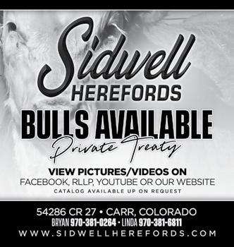 and yearlings. Sired by TJ Chief, Tehama Tahoe, TJ Big Easy, TJ Flatiron, MR SR Highlife, EWA Peyton or sons of TJ Main Event and SAV Rainfall. Call James Dilka/Dilka Cattle, 970-396-8791, thedilkas@aol. com 3/23 Jane Evans Cornelius 970-371-0500 Hampton Cornelius 970-396-2935 18300 CO RD. 43 ~ La Salle, CO 80645 See Bull Info & Videos on Website & Facebook Polled & Horned Hereford Bulls - Private Treaty Sale CRR Herefords Good for your Business Look to CRR Baldie Makers... ...Proven to Increase your Bottom Line. COYOTE RIDGE RANCH Katie Cornelius & Lee Mayo 970-396-8320 www.coyoteridgeherefords.com Family & Nurse Cows Horses BEST OF THE BIG HORNS HORSE SALE, APRIL 13, Buffalo Livestock Marketing, 44 TW Rd., Buffalo, WY. Online bidding through www.cattleusa. com, register 3 days prior to sale. Contact Ellen Allemand, 307-751-8969 or Kay Lynn Allen, 406-697-5882. Visit us on Facebook for updates 4/6 Cattle