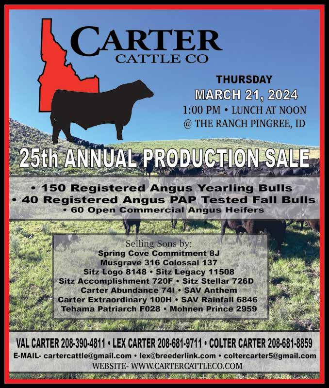 Angus Monday, April 1, 2024 at the ranch Arthur, NE Annual Bull Sale 80 Head of Polled Hereford and Red Angus Bulls Bernie & Stacie Buzanowski 308-726-2138, 406-855-8288 Pasture Wanted WEANER PIGS FOR SALE, located in Powell, WY. For more information, call 307271-1014 8/3 Hereford RegisteRed Angus Bulls P rivate t reaty and F rontier L ive Bridger, MT O pening D ay Saturday