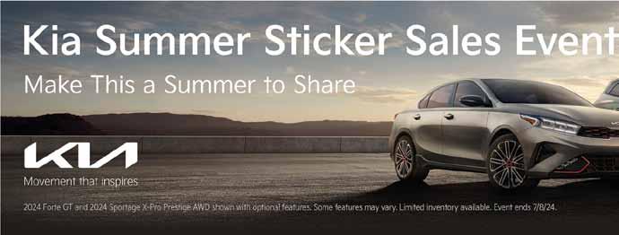 Classifieds All units subject to prior sale. Customer responsible for D&H, taxes and fees. 2999 Nationway 775-0123 Open: M onday-Friday 戟 8am-7pm Saturday 戟 8am-6pm See our complete inventory online at www.kiaofcheyenne.com. Plus D&H , tax , title and license Dawning Red X-Line Premium Package Cross Bars 戟 Skid Plate Carpeted Floor Mats 戟 Tow Hitch Interior Light Kit MSRP: STK# 7602 2024 Kia Sportage X-Line AWD Plus D&H , tax , title and license 2025 Kia K5 GT-Line AWD STK# 7736 Snow White Pearl hite Carpeted Floor Mats MSRP: Af ter $2, 509 D ealer Discount . Plus D&H , tax , title and license See Dealer for details . E xpires 6/20/2 Gravit y Blue 戟 MSRP $40,540 24 Carpeted Floor Mats SALE PRICE: STK# 7469 2023 Kia Sorento Hybrid EX AWD Af ter $ 400 Dealer Discount . Plus D&H , tax , title and license. See Dealer for details Expires 6/20/24 2024 Kia Telluride L X V6 AWD STK# 7737 Glacial White Pearl 戟 MSRP $40,305 Pearl 戟 MSRP Carpeted Floor Mats SALE PRICE: Week of June 14, 2024 Father’s Day Gi F t iD eas on Pa G es 7-9