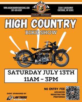 SHOW, SAT, JULY 13, 11am-3pm No entry fee, advanced registration preferred, event sponsored by Law Tigers, motorcycle lawyers High Country Harley Davidson, 3320 E L i n c o l n wa y, C h ey e n n e www highcountrycheyen ne com, 307-638-8307
