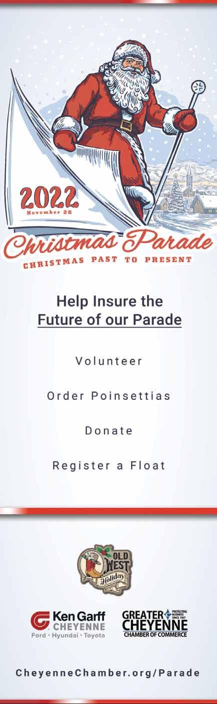 Page 2 TRADER’S Week of November 11, 2022 ALONG OTHER LINES Store Hours: Monday-Friday 7 to 5 Saturday 8 to 3 57 1965-2022 Years 1222 Dunn Ave. Cheyenne, WY 82001 Two Convenient Locations in Cheyenne 3301 E. NATIONWAY 2131 MASON WAY Off Converse, Across From The Post Office Open Mon-Sat 9am-7pm Sun 10am-6 pm This Holiday Season begins at home with • Gift Ideas • Home Decor • Clothing Everything that belongs under the tree! MJ Auto Sales “ When They Say No Way, Come To MJ!” 1310 W. Lincolnway • 307-514- 6565 MJAu toSa lesW Y.com Join Us For Food , Beer & Fun! Thursd ay, Nov. 17 • 4p m CHAMBER OF COMMERCERED CARPET RIBBON CUTTING EVENT LANDLORDS, HOME OWNERS, ARE YOU looking for a handyman for your properties? I'm a local handyman with 6+ years of experience with a general contractor Professional and trust worthy Text or call Nick at 307 287 6471 to schedule a free quote, please leave a voicemail LEGENDARY LAWN CARE Looking to get leaves cleaned up? Starting at $100, get on our list while there's still room Call 307 214 4002 MAGIC CITY ENTER PRISES' 2022 FESTIVAL of Trees "Candy Cane Christmas" Fri Dec 2 2022 from 6pm 10pm at Little America Hotel and Resort 2800 W Lincoln way, Cheyenne, WY 82009 Buy tickets un der the events tab at: w w w mcew yo org