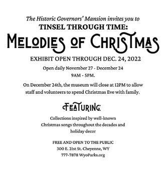 THE HISTORIC GOVERNORS' MANSION invites you to Tinsel Through Time: Melodies of Christmas Exhibit open Nov 27 through Dec 24, 2022, daily from 9am 5pm On Dec 24 the Mu seum will closed at 12pm to allow staff and volun teers to spend Christmas Eve with family Featuring: Collections inspired by w e l l k n o w n C h r i st m a s songs throughout the decades and holiday de cor Free and open to the public 300 E 21st St, Cheyenne WY 307 777 7878, WyoParks org