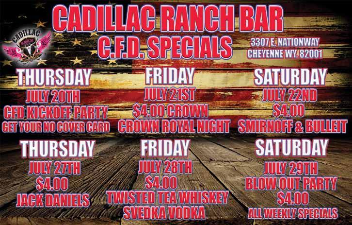 The terms Cheyenne Frontier Days™, Frontier Days™, the arrowhead logo and the CF reverse D™ are registered trademarks of Cheyenne Frontier Days™, Inc., and are being used with permission. This magazine is an unofficial publication of Cheyenne Frontier Days™, published by Trader’s Publishing. It is available free as a guide to restaurants, shopping, entertainment, and the CFD Schedule of Events. Cover photo courtesy of Debbie Martinez. The Cheyenne merchants who have advertised in this magazine have paid for the production of this magazine. The publisher encourages your patronage of our advertisers who represent a wide variety of businesses. All rights reserved. No portion may be reproduced without written consent of the publisher. Trader’s Shopper’s Guide reserves the right to reject or edit any advertisement. Trader’s is not financially responsible for typographic errors or omissions. Liability shall not exceed the portion of space attributable to the error. Trader’s must be notified within 7 days of publication. Credit is allowed for one insertion only.
